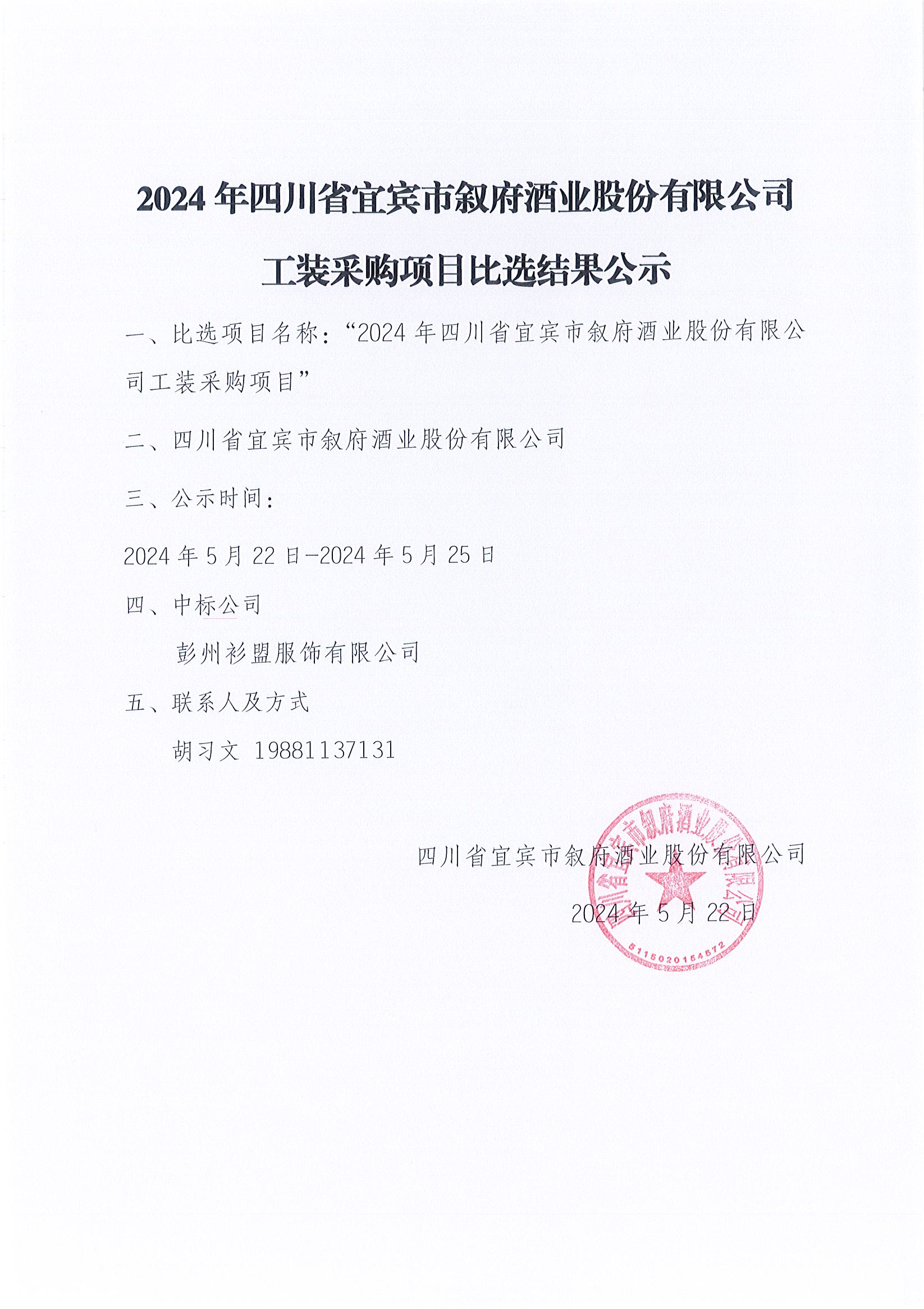 四川省敘府酒業(yè)銷(xiāo)售有限公司品牌文化衫、白蓋專(zhuān)屬類(lèi)促品物料采購項目標段一中標結果公示公告