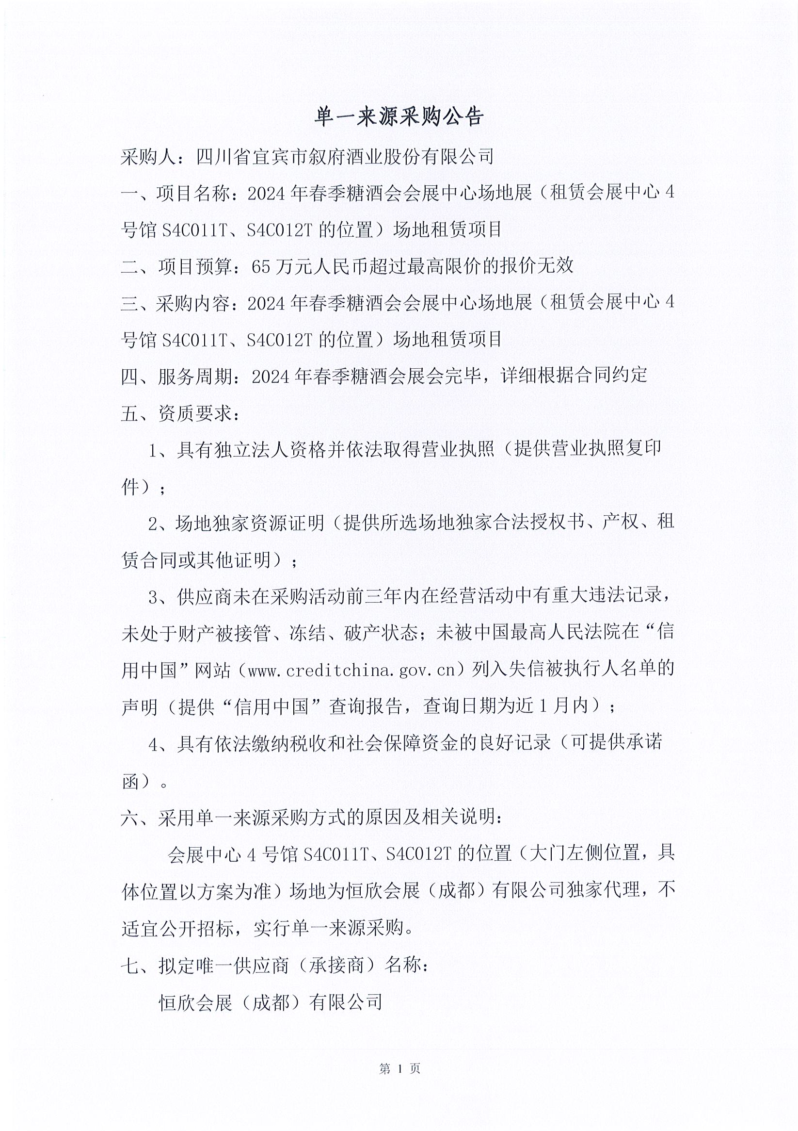 四川省宜賓市敘府酒業(yè)股份有限公司2024年春季糖酒會(huì )(會(huì )展中心場(chǎng)地展)場(chǎng)地租賃公示公告