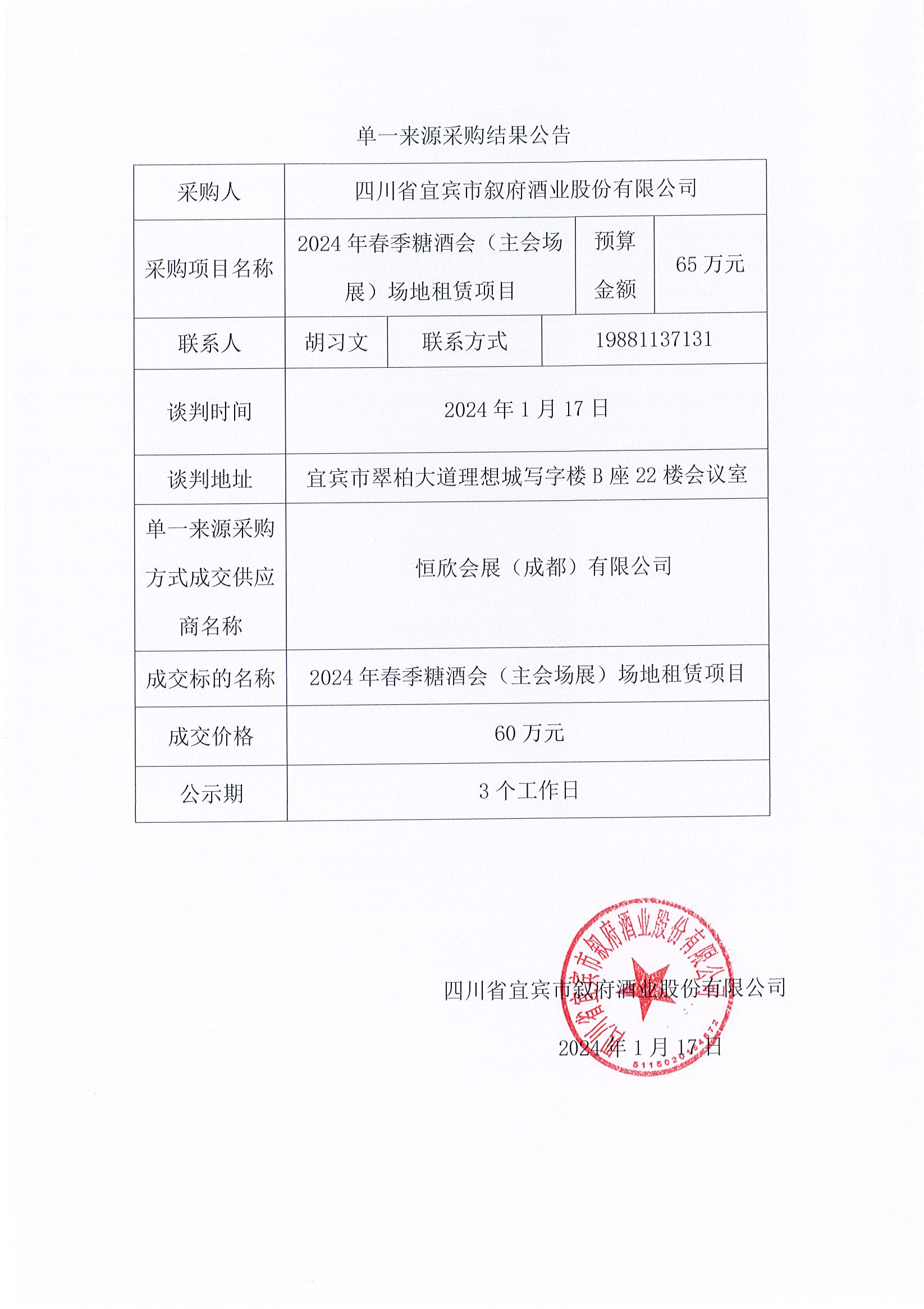 四川省宜賓市敘府酒業(yè)股份有限公司 2024年春季糖酒會(huì )(成都泰合國際大飯店)場(chǎng)地租賃公示公告