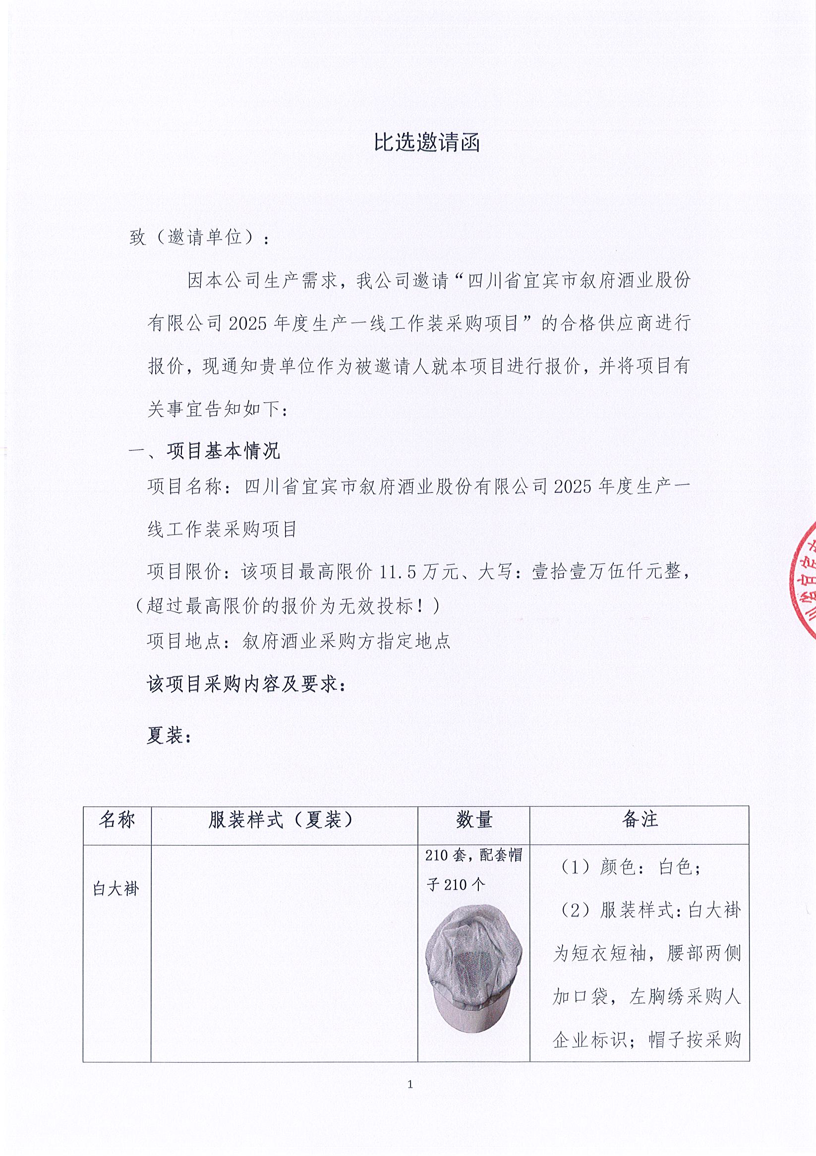 四川省宜賓市敘府酒業(yè)股份有限公司2025年度生產(chǎn)一線(xiàn)工作裝采購項目比選公告