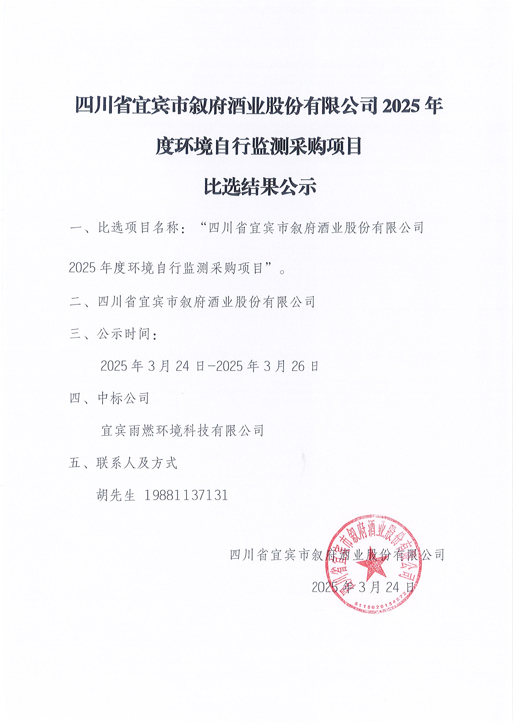 四川省宜賓市敘府酒業(yè)股份有限公司2025年度環(huán)境自行監測采購項目比選結果公示