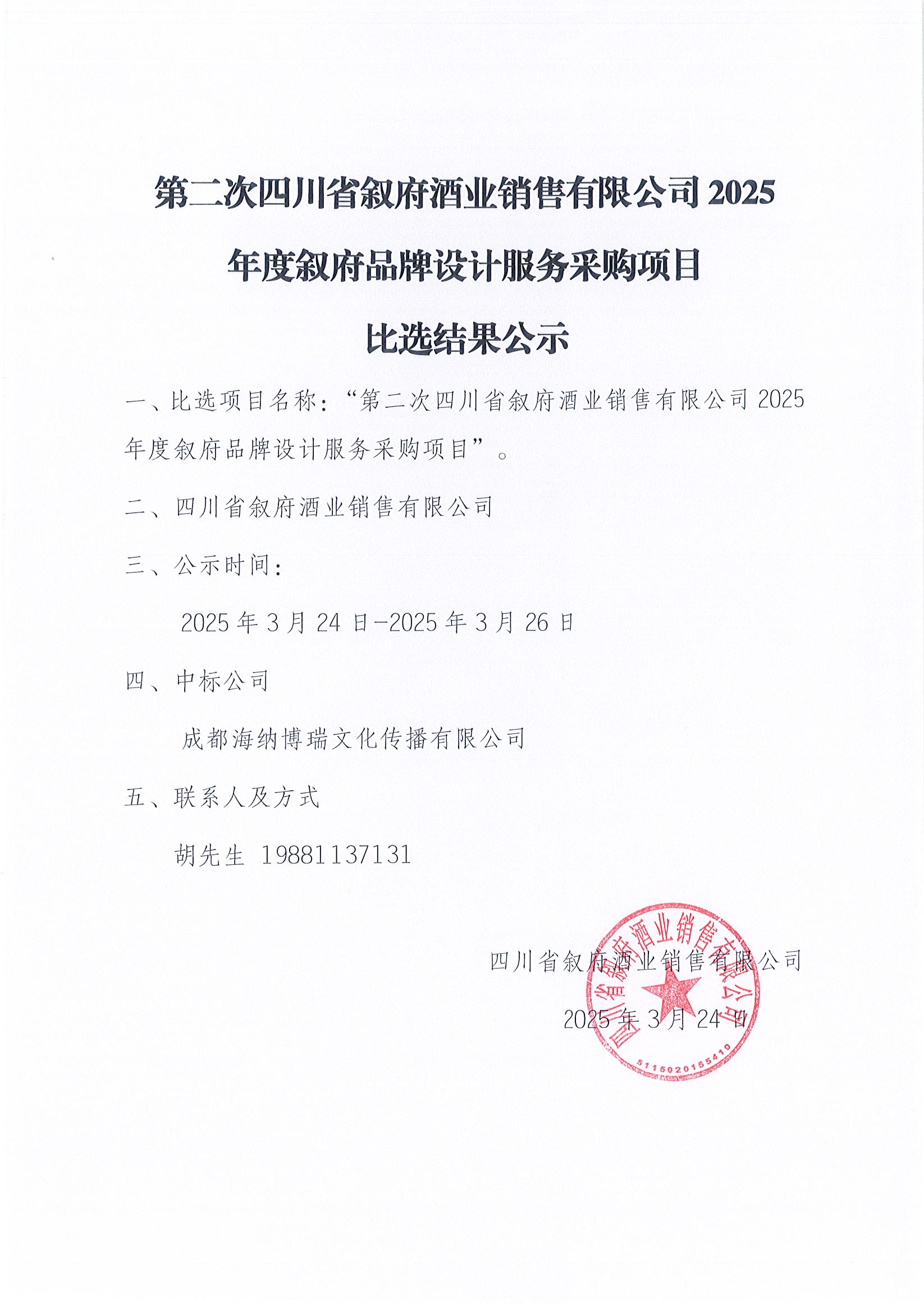第二次四川省敘府酒業(yè)銷(xiāo)售有限公司2025年度敘府品牌設計服務(wù)采購項目比選結果公示