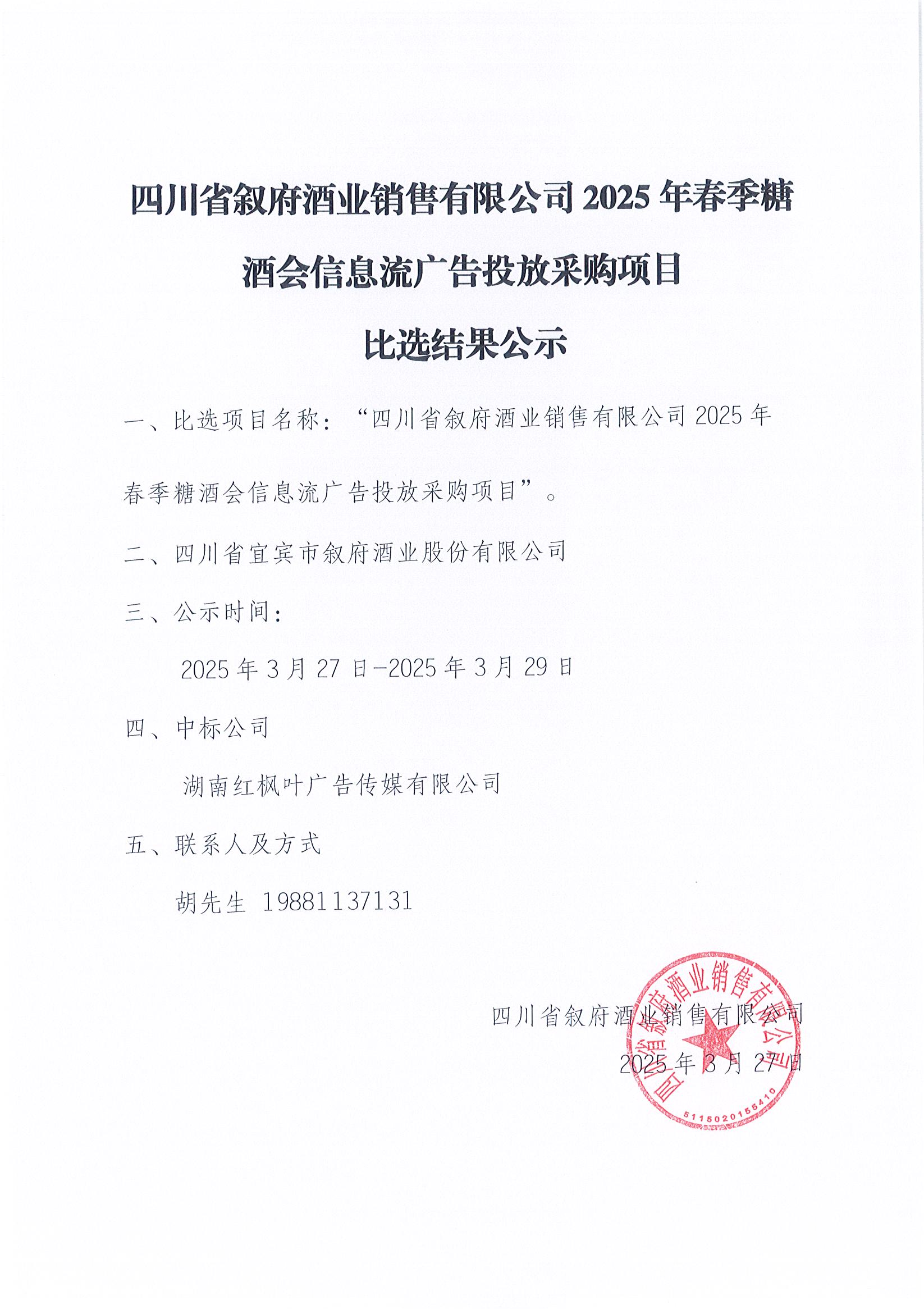 四川省敘府酒業(yè)銷(xiāo)售有限公司2025年春季糖酒會(huì )信息流廣告投放采購項目比選結果公示