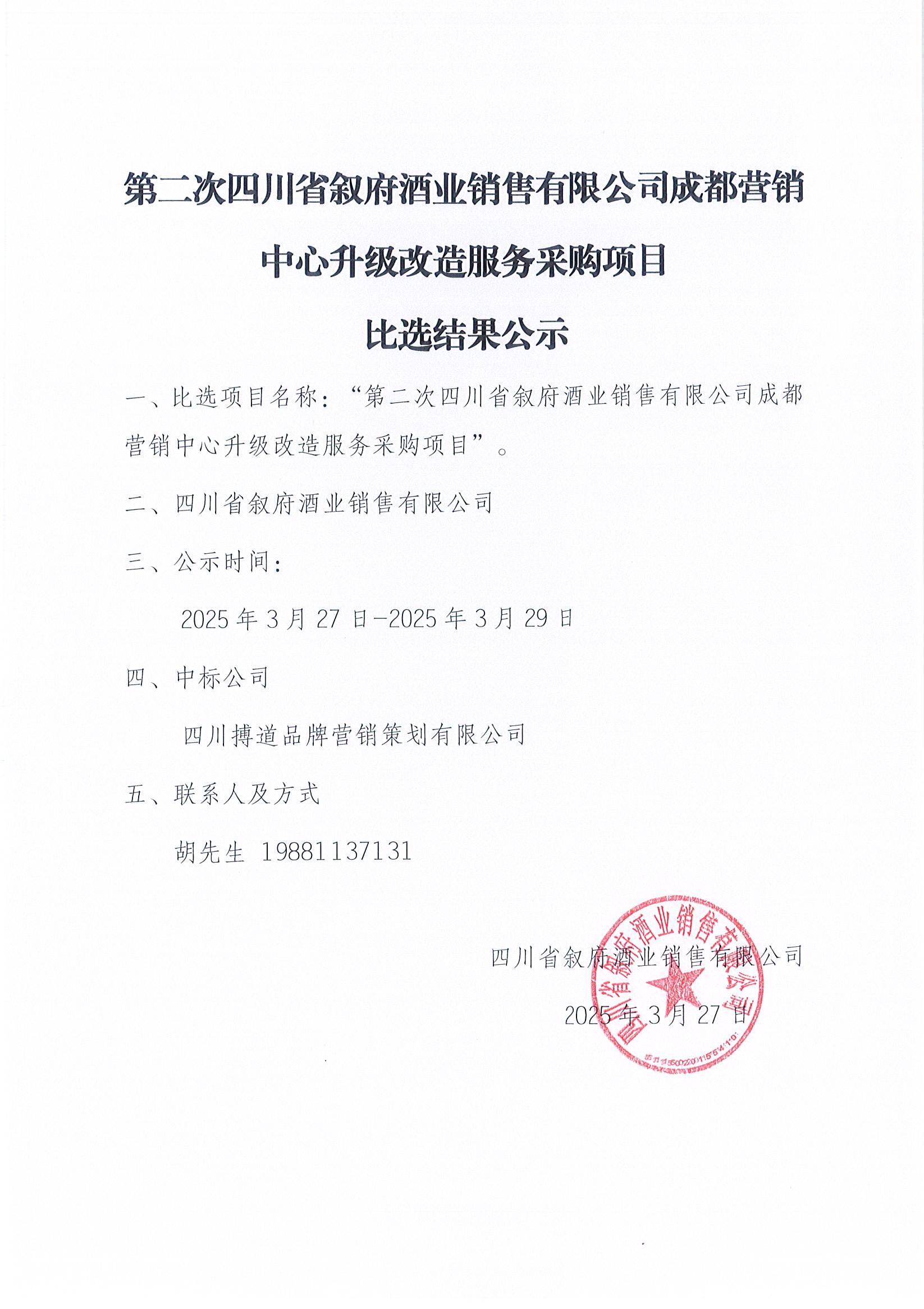 第二次四川省敘府酒業(yè)銷(xiāo)售有限公司成都營(yíng)銷(xiāo)中心升級改造服務(wù)采購項目比選結果公示