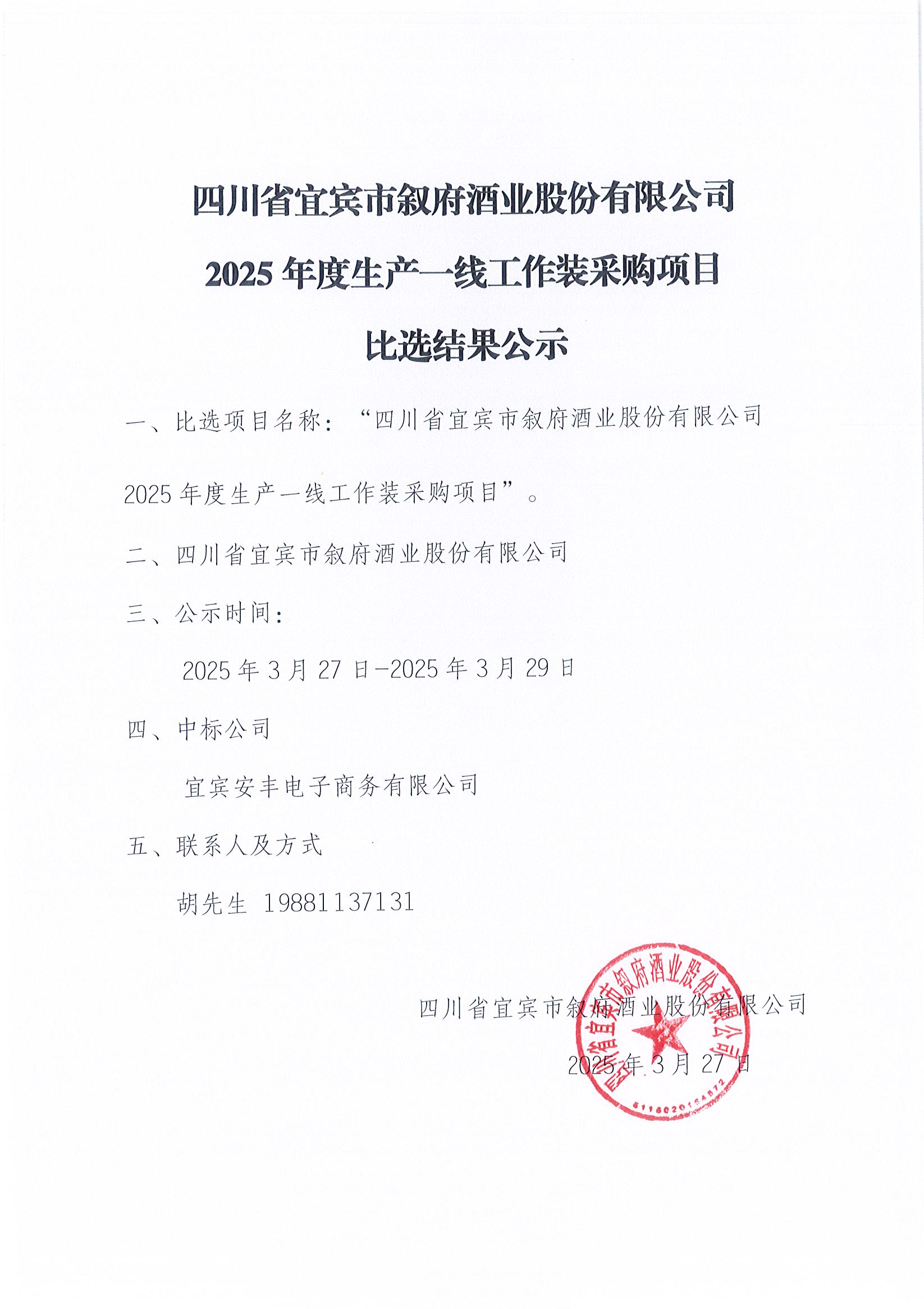 四川省宜賓市敘府酒業(yè)股份有限公司2025年度生產(chǎn)一線(xiàn)工作裝采購項目比選結果公示