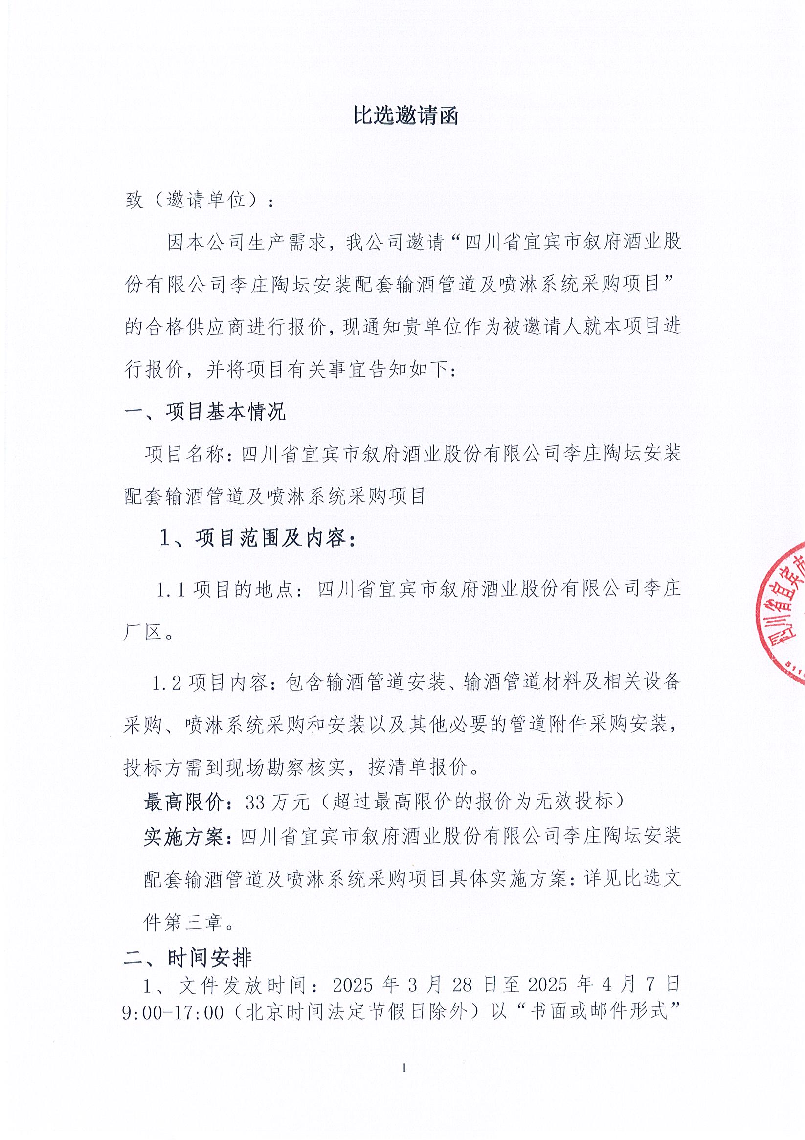 四川省宜賓市敘府酒業(yè)股份有限公司李莊陶壇安裝配套輸酒管道及噴淋系統采購項目比選公示公告