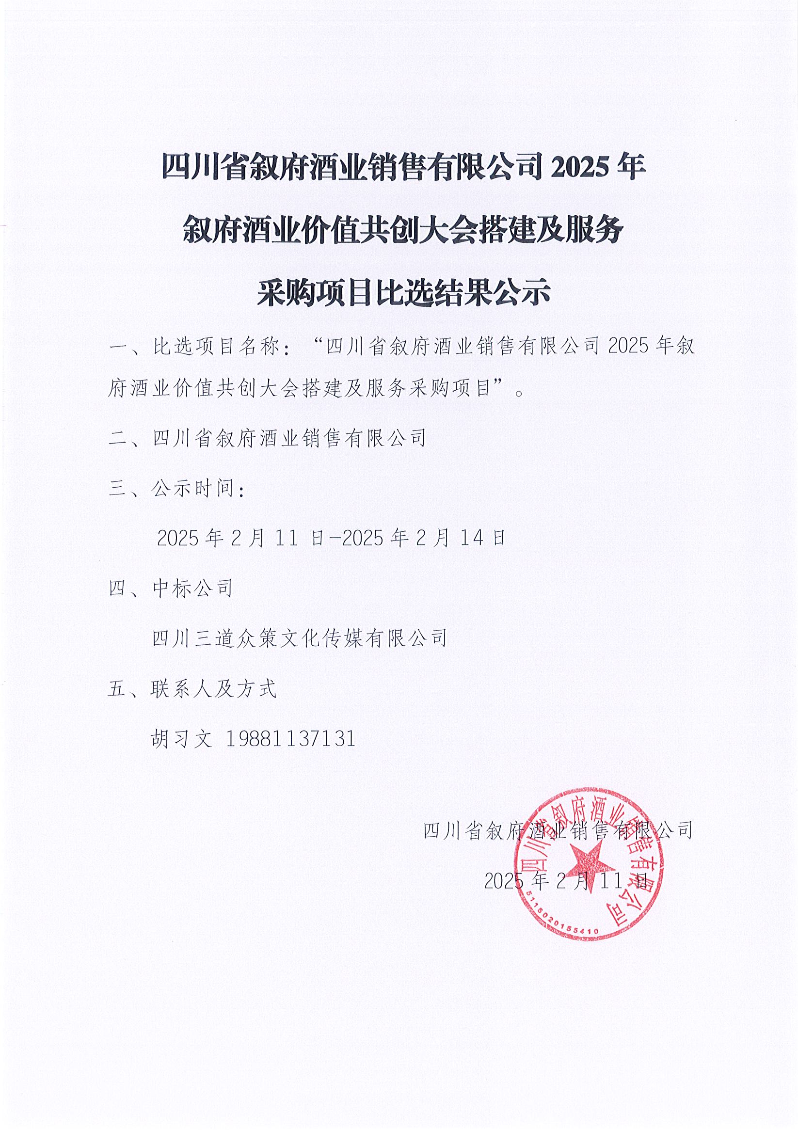 四川省敘府酒業(yè)銷(xiāo)售有限公司2025年敘府酒業(yè)價(jià)值共創(chuàng )大會(huì )搭建服務(wù)采購項目比選結果公示公告