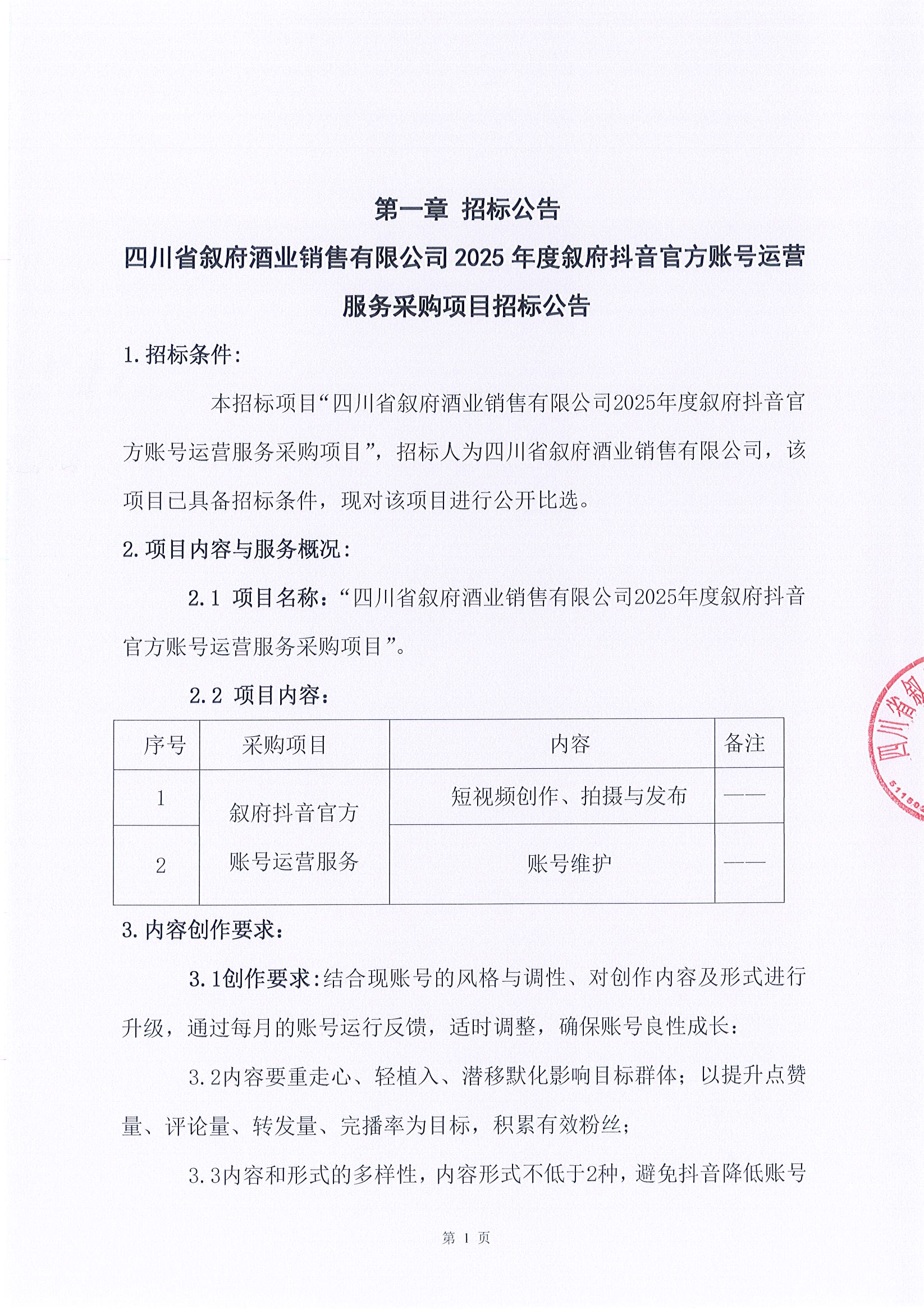 四川省敘府酒業(yè)銷(xiāo)售有限公司2025年度敘府抖音官方賬號運營(yíng)服務(wù)采購項目公開(kāi)比選招標公示公告