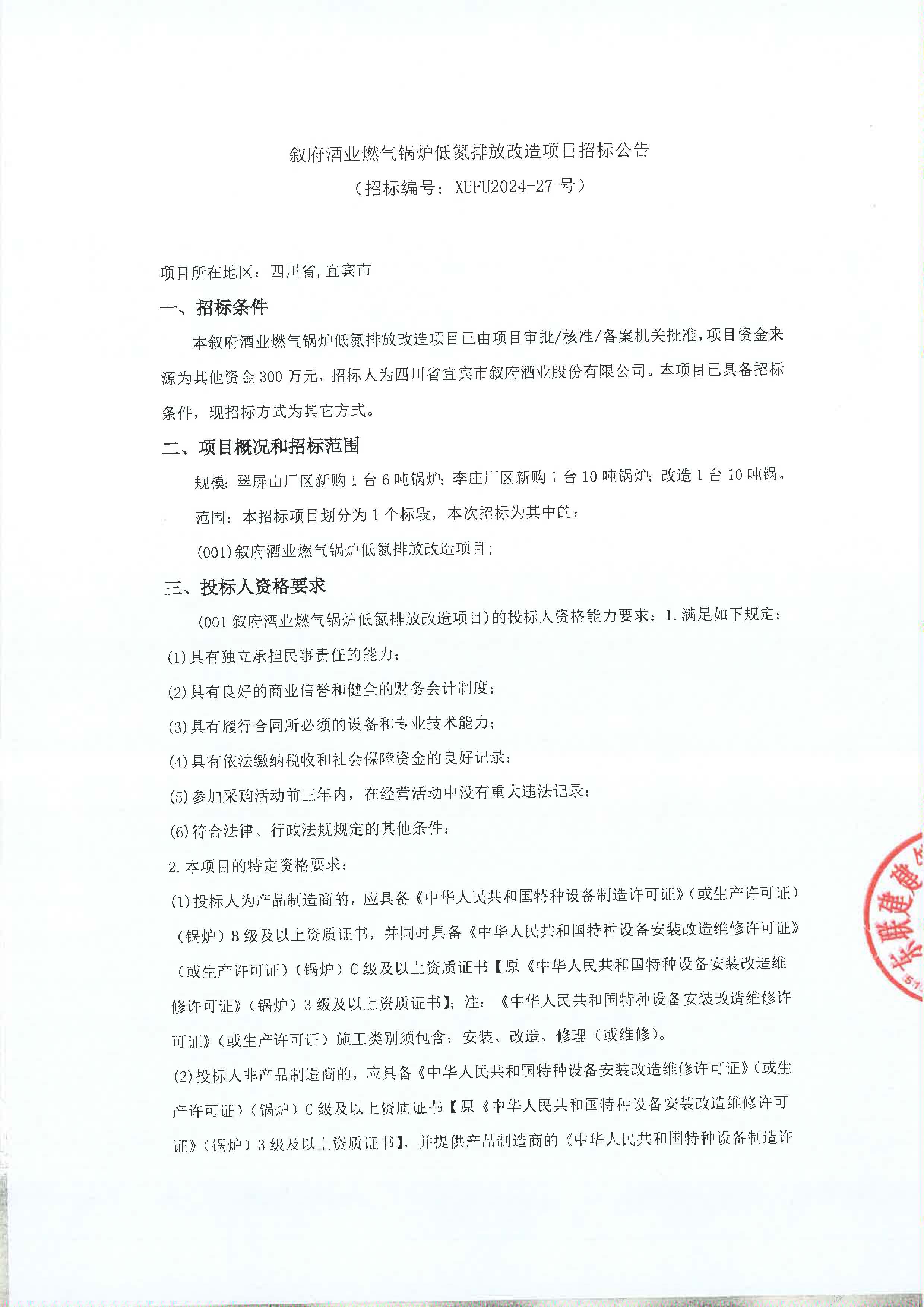 四川省宜賓市敘府酒業(yè)股份有限公司 燃氣鍋爐低氮排放改造項目招標公告