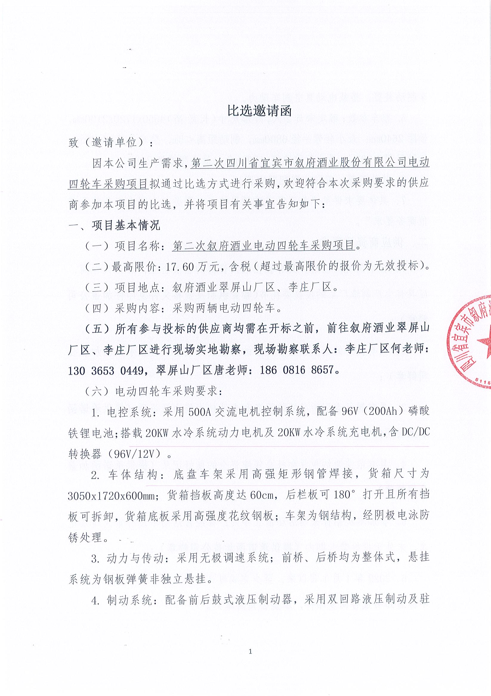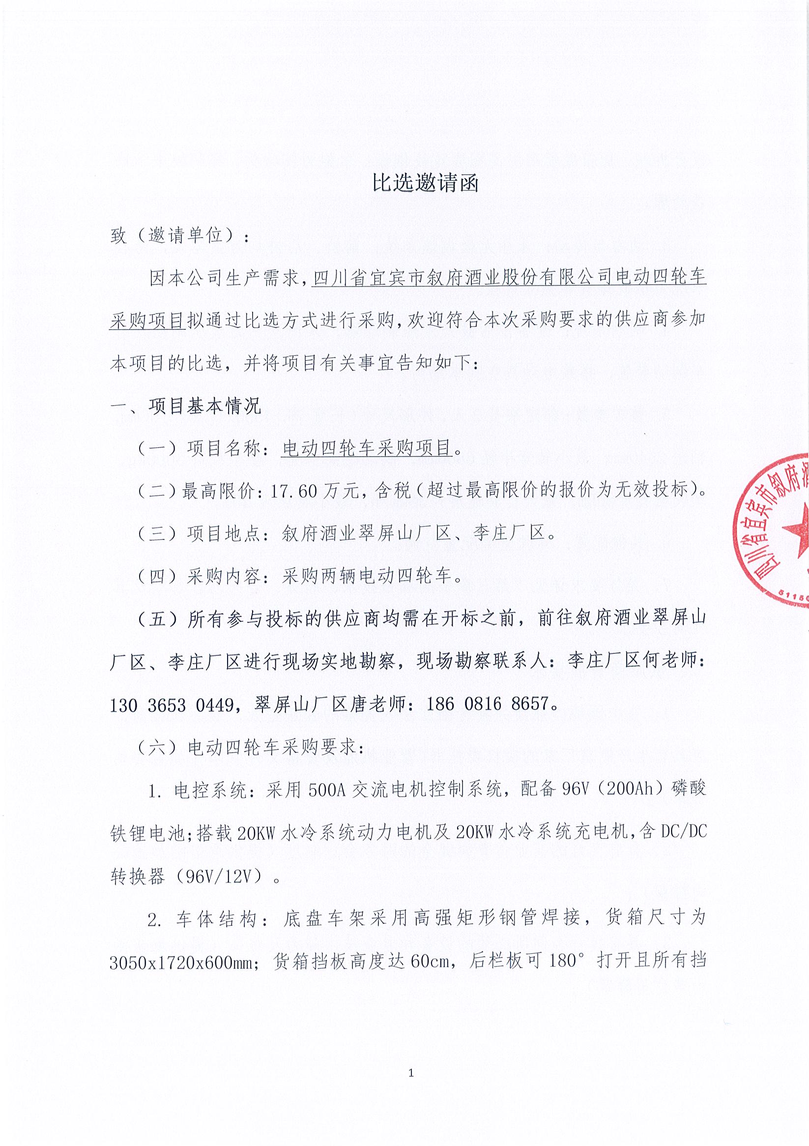 四川省宜賓市敘府酒業(yè)股份有限公司電動(dòng)四輪車(chē)采購(gòu)項(xiàng)目比選招標(biāo)公告