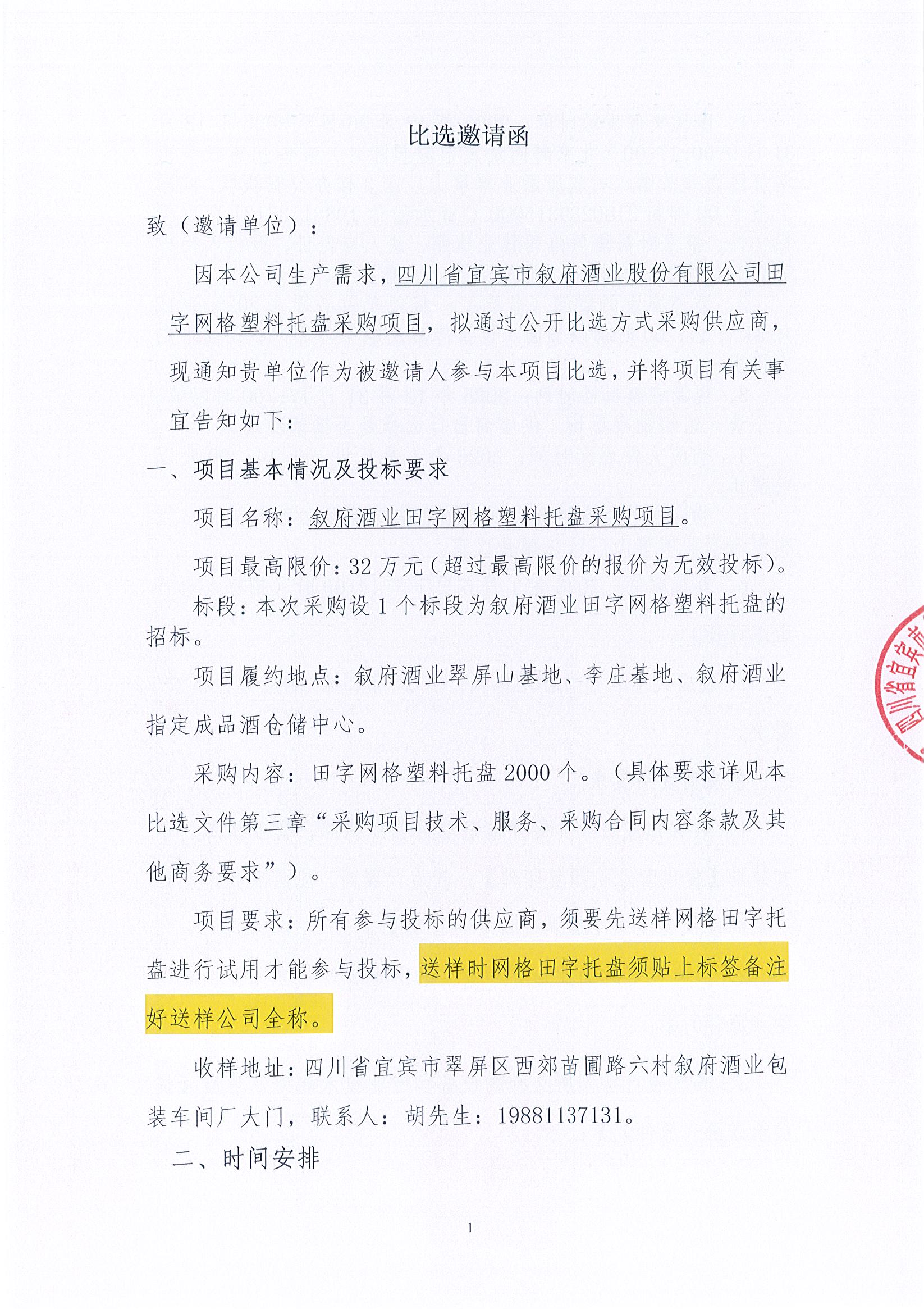 四川省宜賓市敘府酒業(yè)股份有限公司田字網(wǎng)格塑料托盤(pán)采購(gòu)項(xiàng)目比選招標(biāo)公告