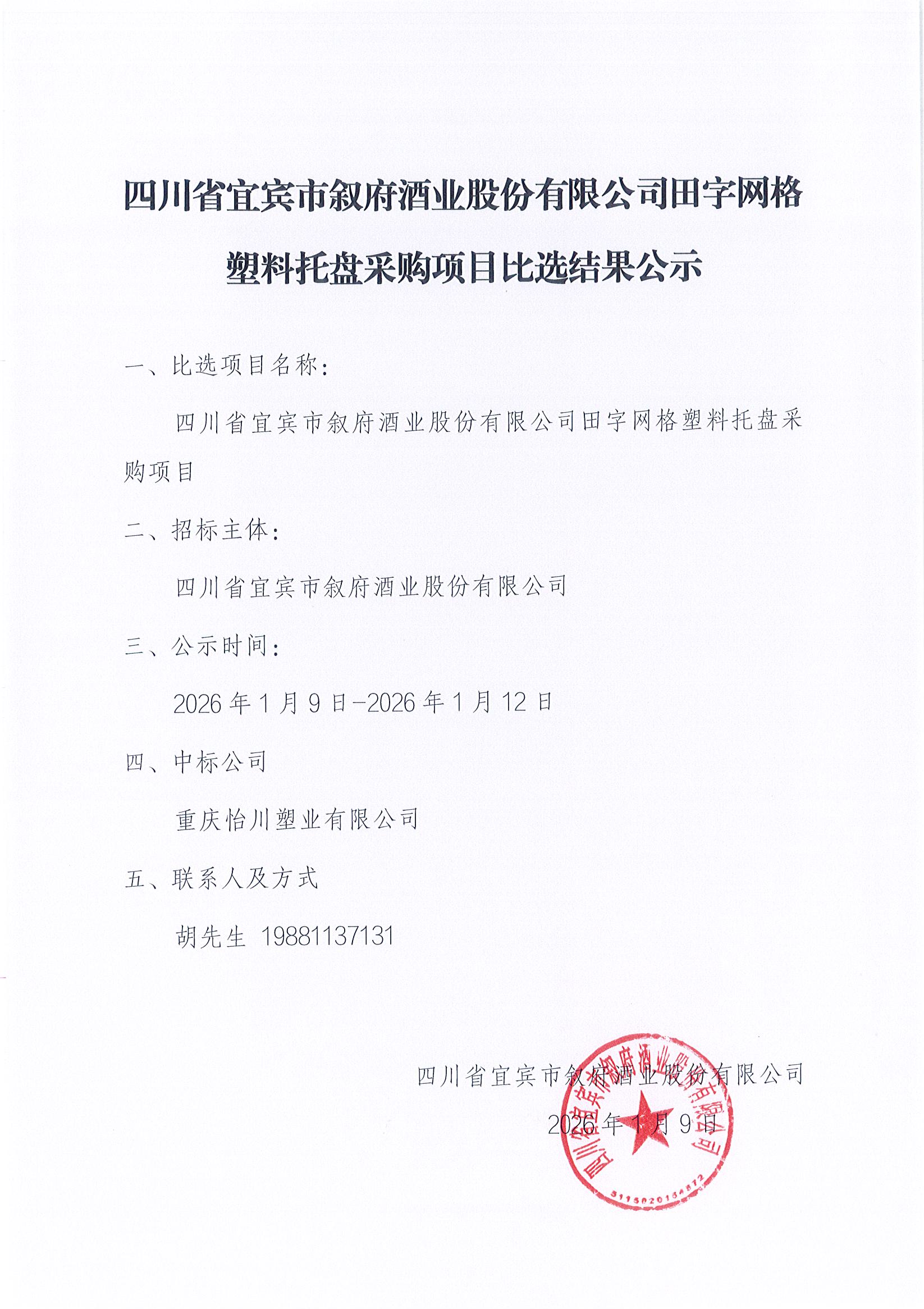 四川省宜賓市敘府酒業(yè)股份有限公司田字網(wǎng)格塑料托盤(pán)采購(gòu)項(xiàng)目比選結(jié)果公示公告