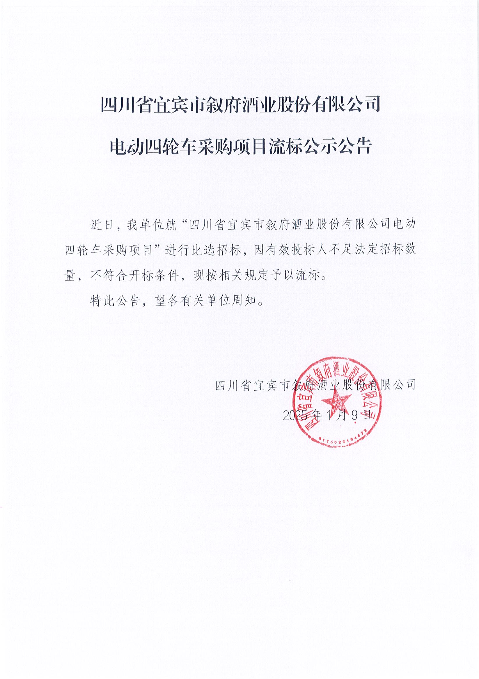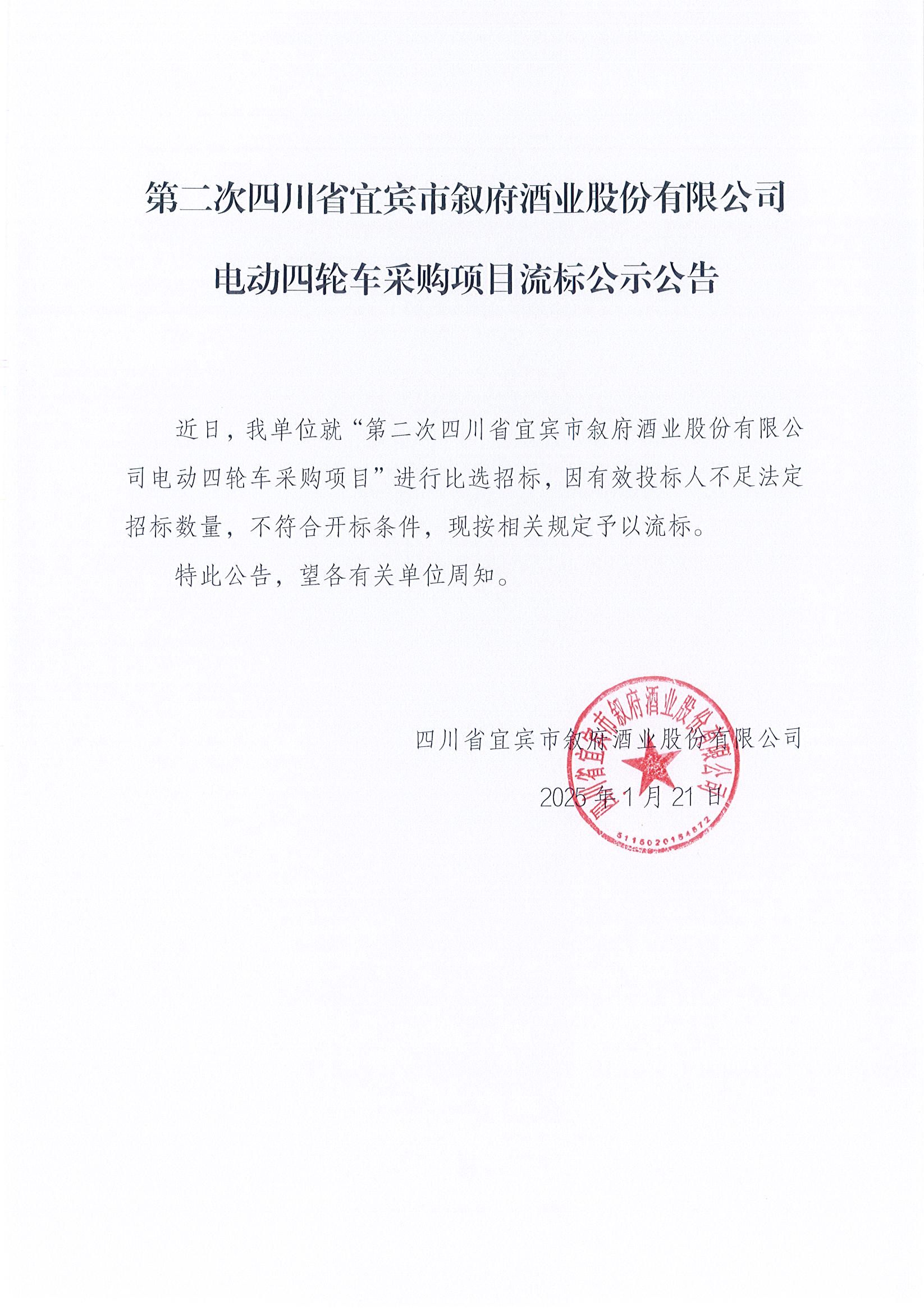 四川省宜賓市敘府酒業(yè)股份有限公司電動(dòng)四輪車(chē)采購(gòu)項(xiàng)目流標(biāo)公示公告