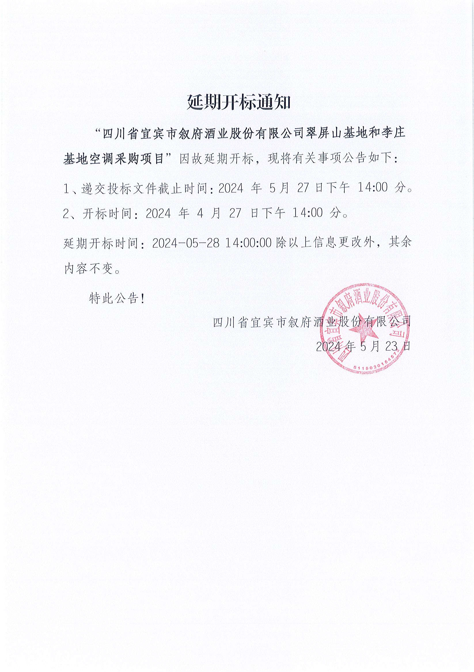 四川省宜賓市敘府酒業(yè)股份有限公司翠屏山基地和李莊基地空調采購項目延期開(kāi)標通知