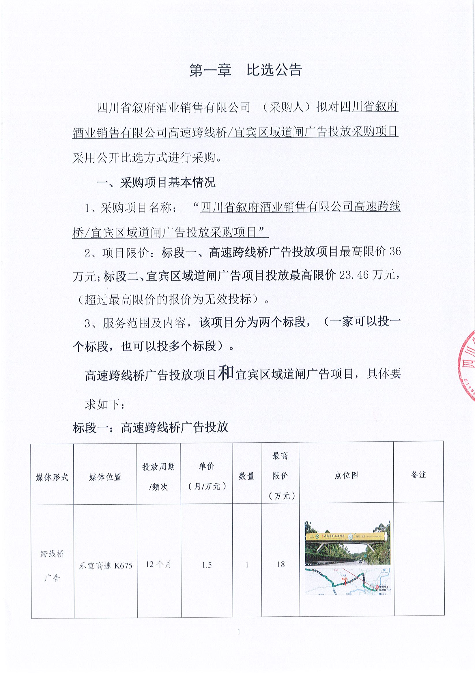四川省敘府酒業(yè)銷(xiāo)售有限公司高速跨線(xiàn)橋/宜賓區域道閘廣告投放采購項目公開(kāi)比選公示公告