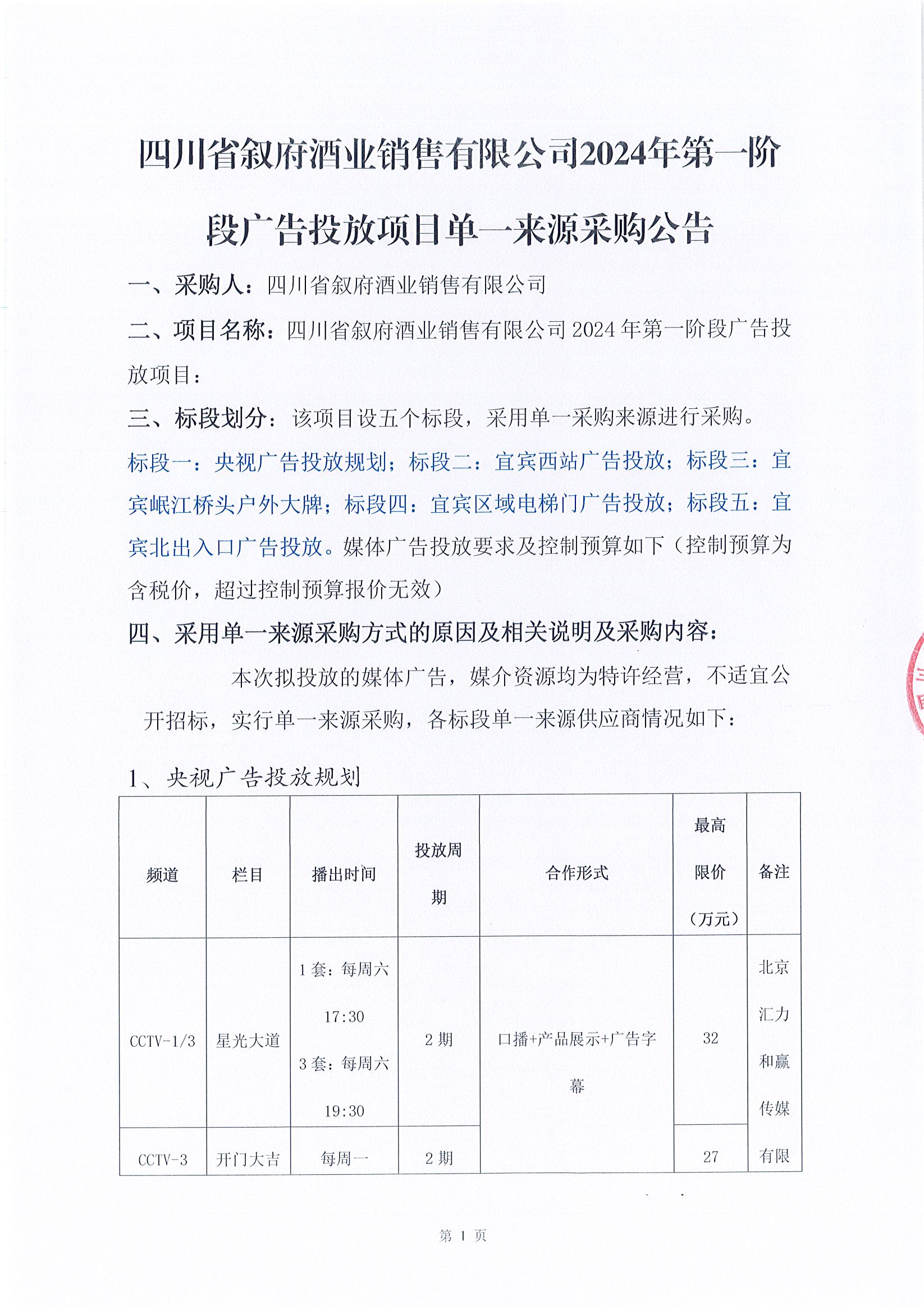 四川省敘府酒業(yè)銷(xiāo)售有限公司2024年第一階段廣告投放項目單一來(lái)源采購公示公告