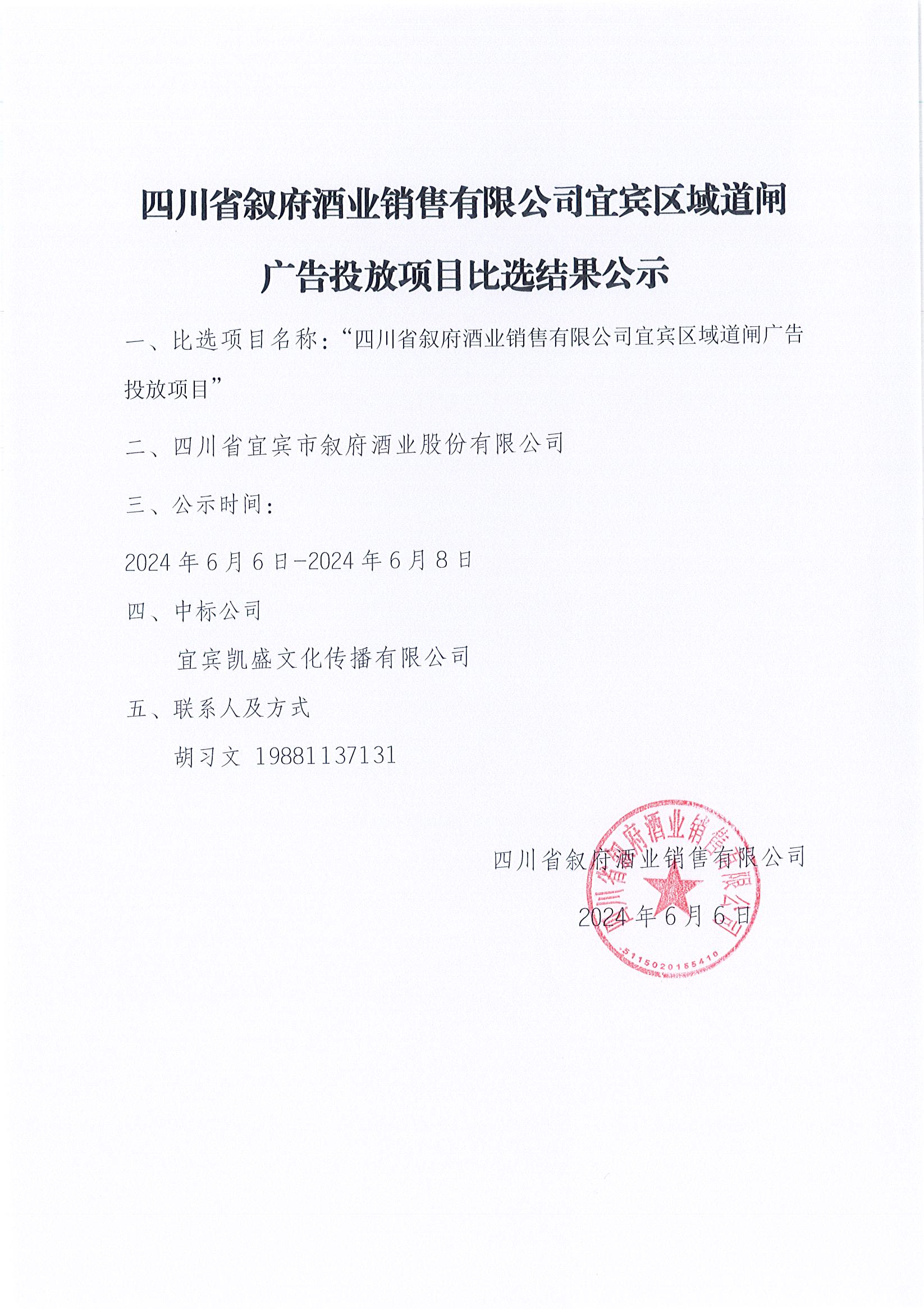 四川省敘府酒業(yè)銷(xiāo)售有限公司高速跨線(xiàn)橋/宜賓區域道閘廣告投放采購項目比選結果公示公告