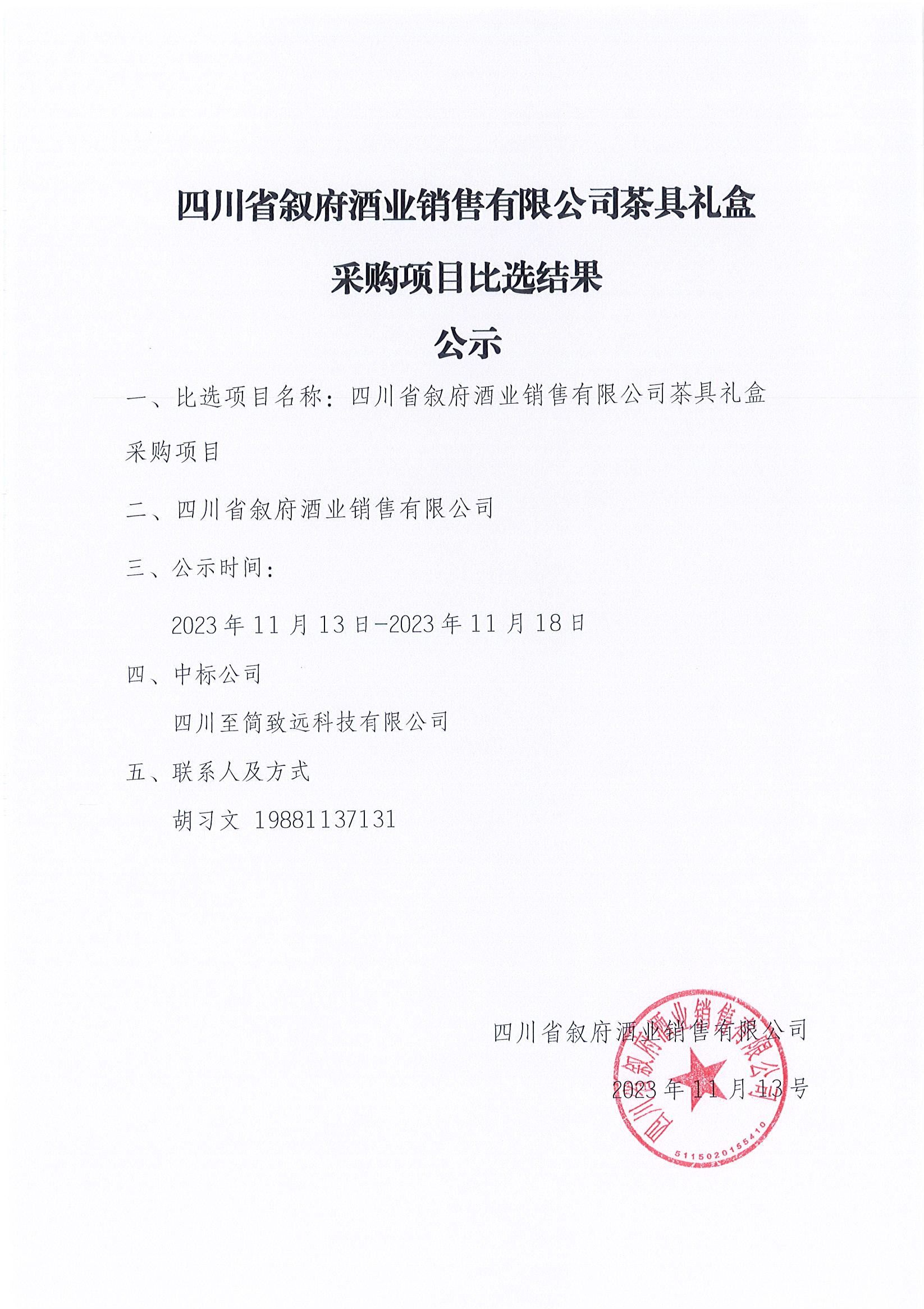 四川省敘府酒業(yè)銷(xiāo)售有限公司茶具禮盒采購項目中標結果公示