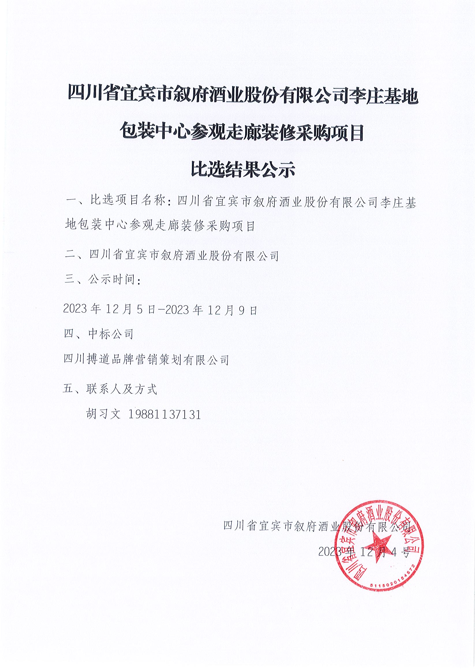 四川省宜賓市敘府酒業(yè)股份有限公司李莊基地包裝中心參觀(guān)走廊裝修采購項目 比選結果公示