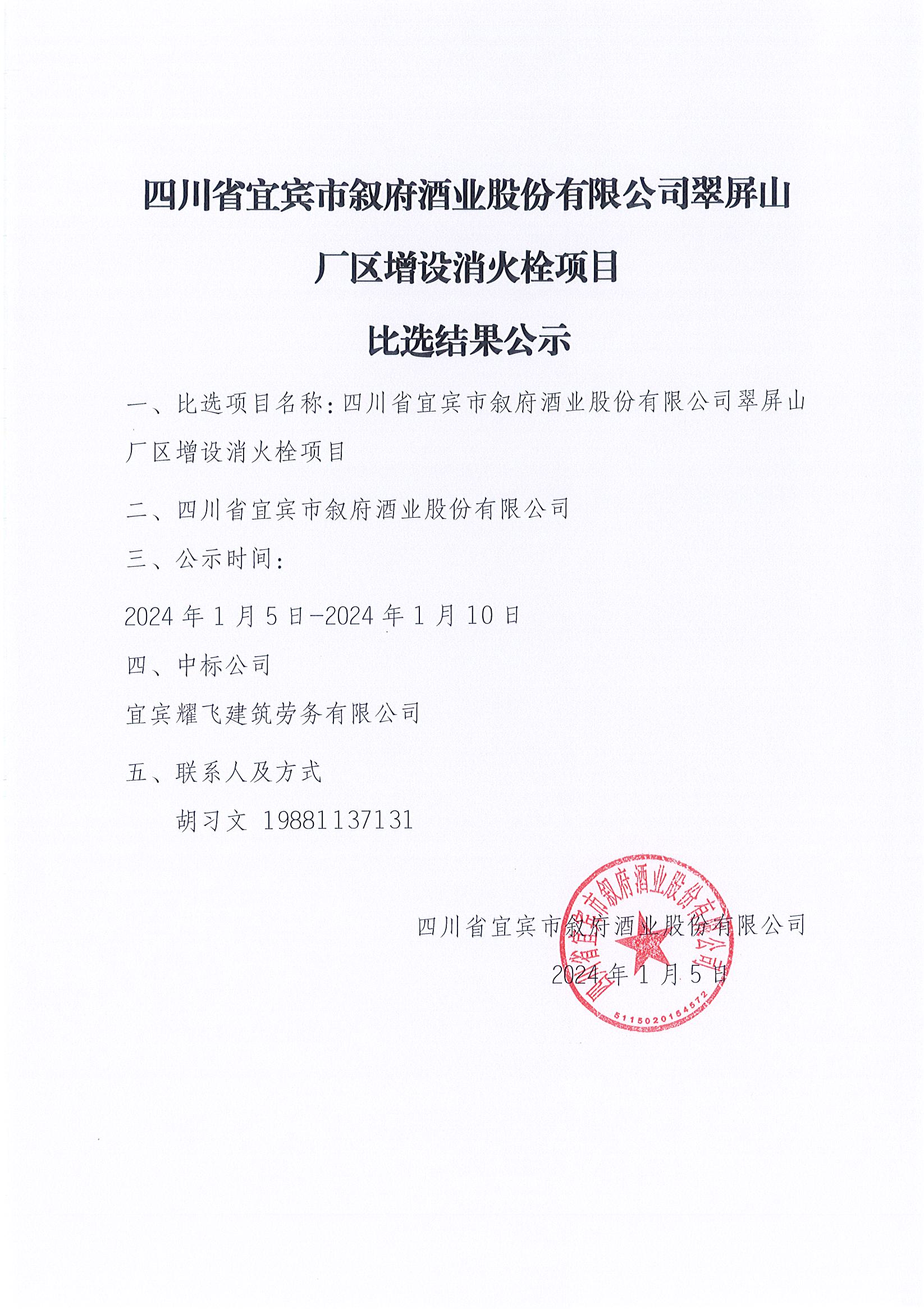 四川省宜賓市敘府酒業(yè)股份有限公司 翠屏山廠(chǎng)區增設消火栓項目中標結果公示公告