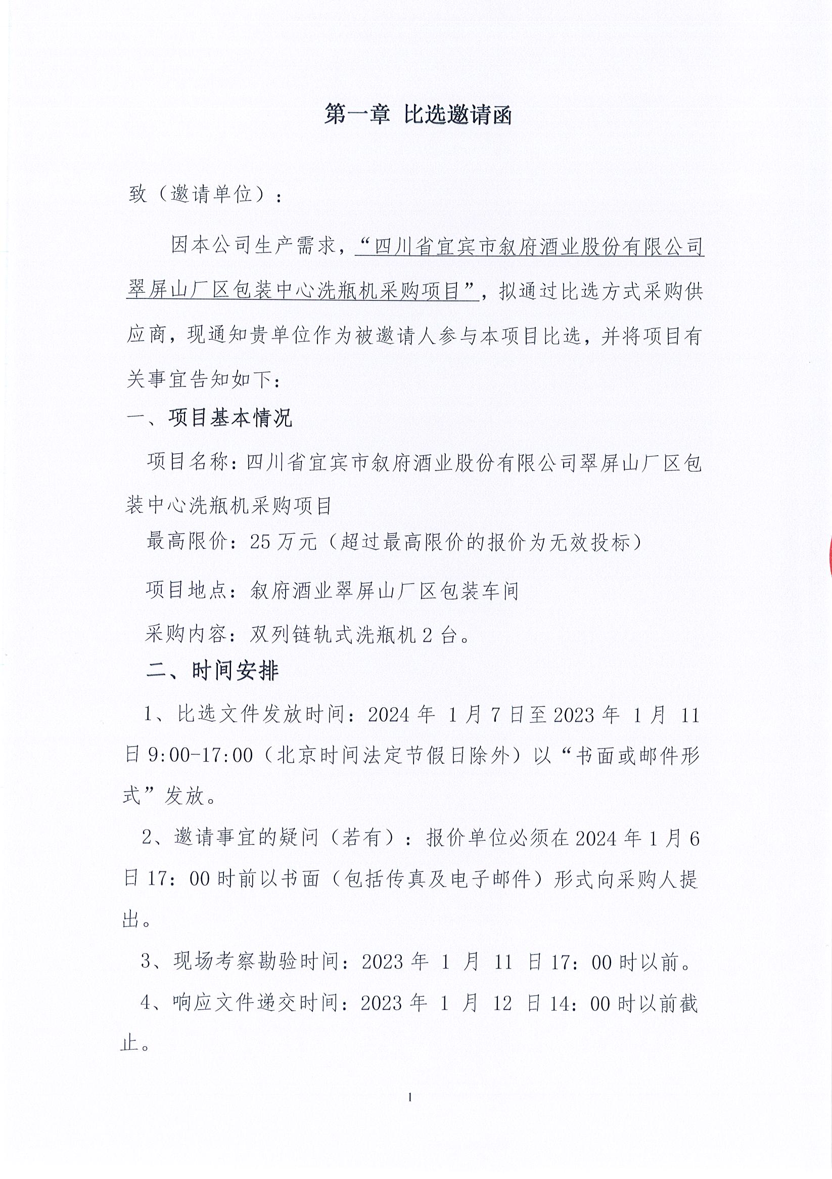 四川省宜賓市敘府酒業(yè)股份有限公司 翠屏山廠(chǎng)區包裝中心洗瓶機采購項目掛網(wǎng)公告