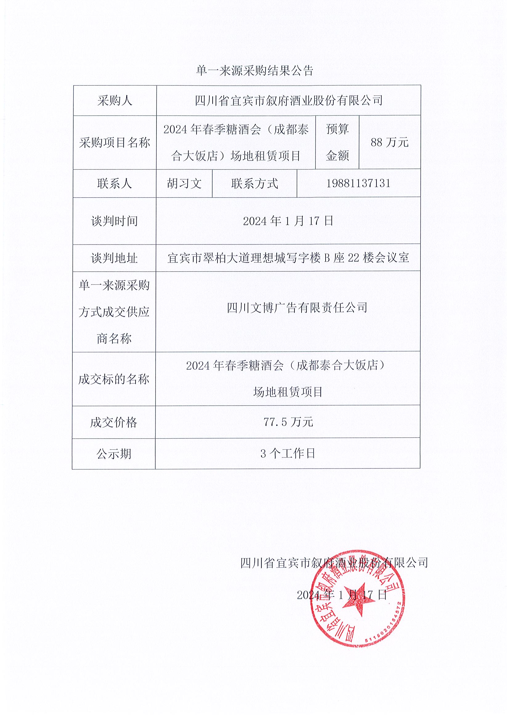 四川省宜賓市敘府酒業(yè)股份有限公司 2024年春季糖酒會(huì )(成都泰合國際大飯店)場(chǎng)地租賃公示公告