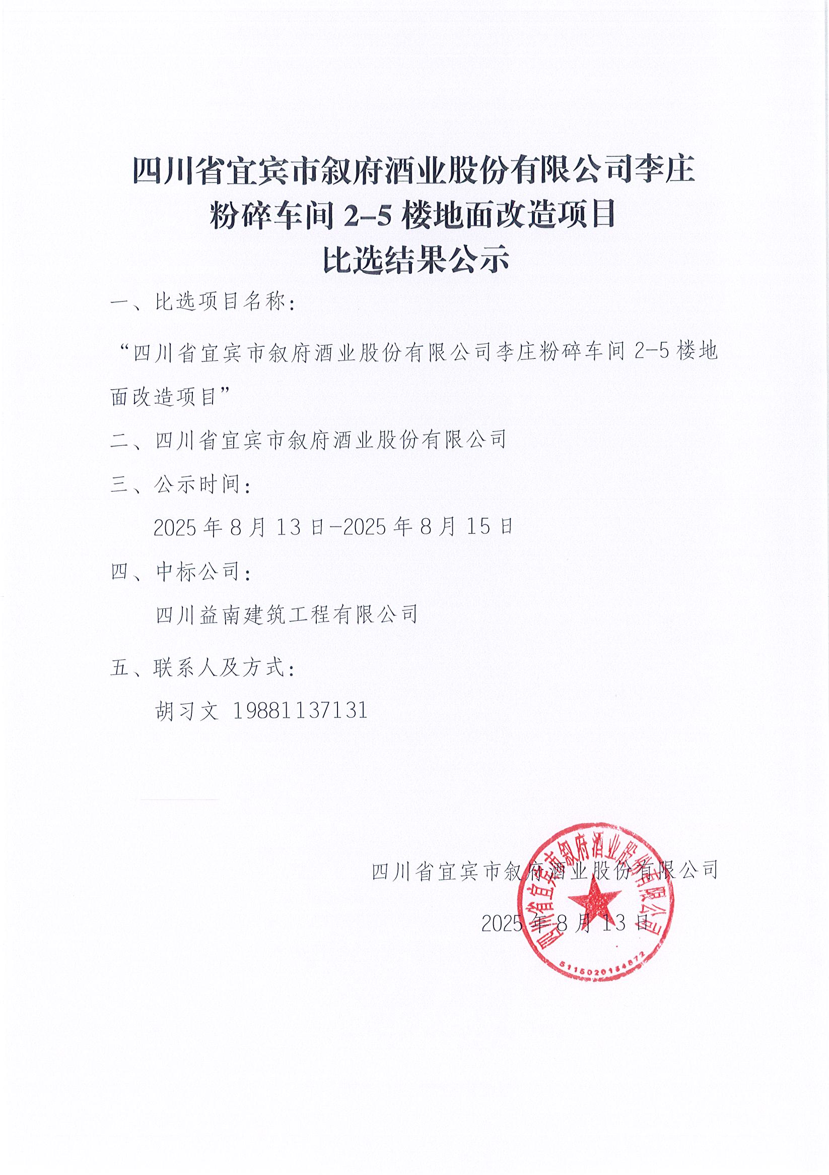 四川省宜賓市敘府酒業(yè)股份有限公司李莊粉碎車(chē)間2-5樓地面改造項目比選結果公告