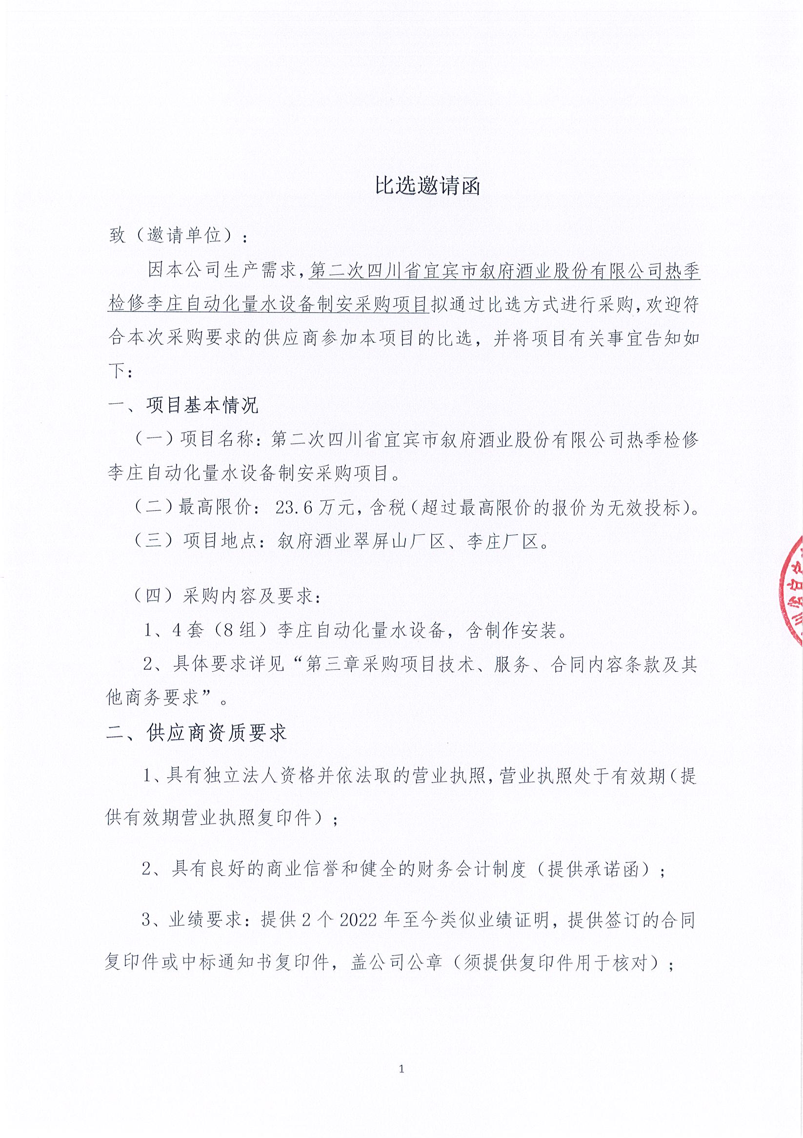 第二次四川省宜賓市敘府酒業(yè)股份有限公司熱季檢修李莊自動(dòng)化量水設備制安采購項目