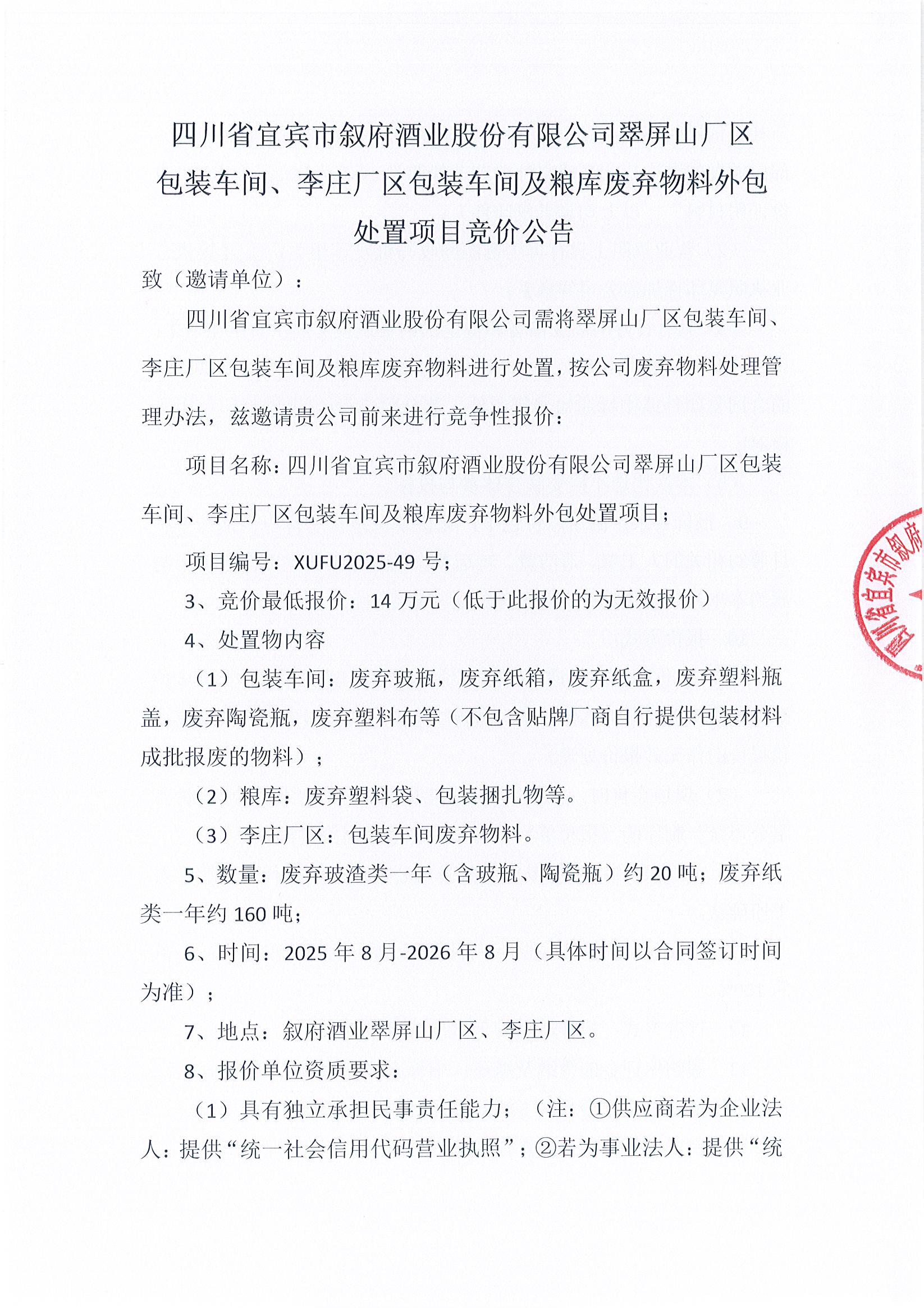 四川省宜賓市敘府酒業(yè)股份有限公司翠屏山廠(chǎng)區包裝車(chē)間、李莊廠(chǎng)區包裝車(chē)間及糧庫廢棄物料外包處置項目