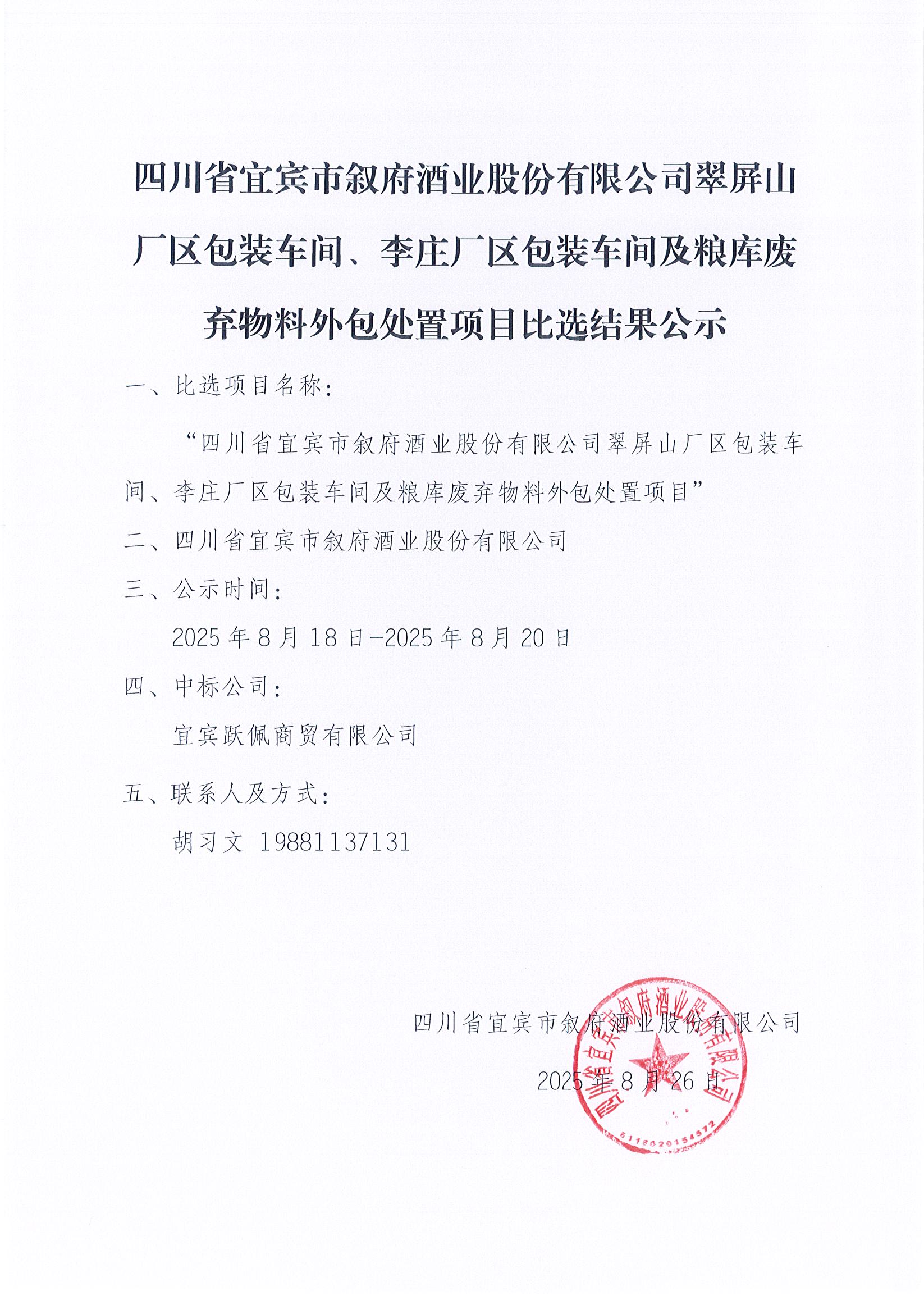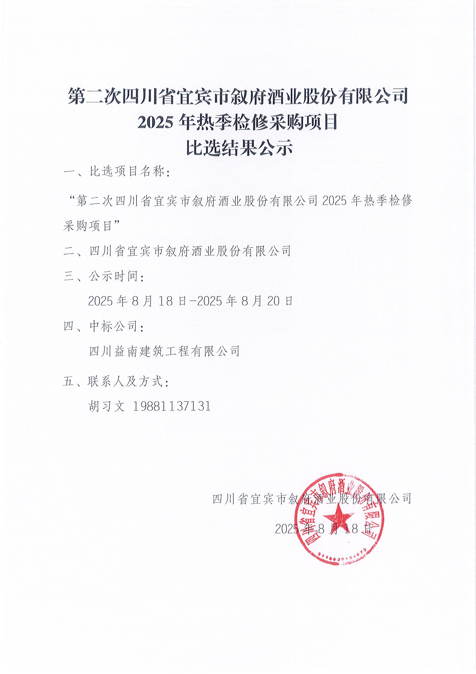 第二次四川省宜賓市敘府酒業(yè)股份有限公司2025年熱季檢修采購項目比選結果公示