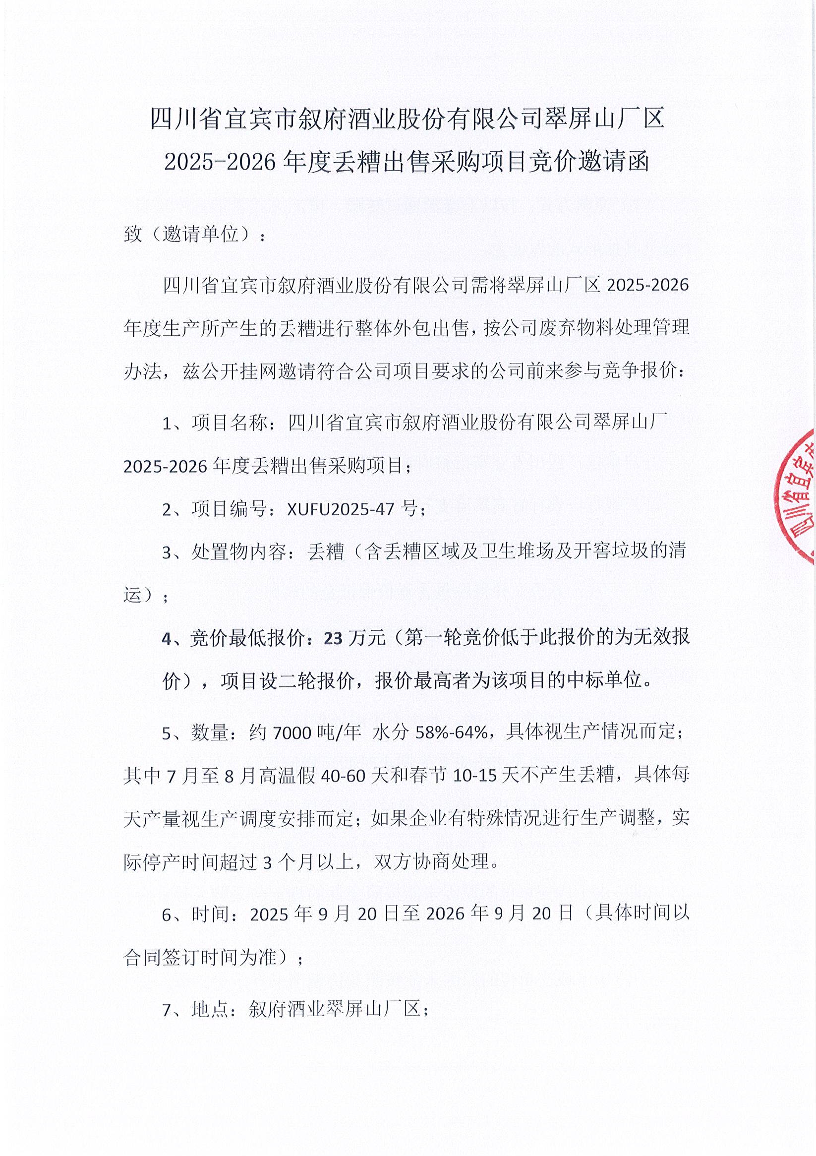 四川省宜賓市敘府酒業(yè)股份有限公司翠屏山廠(chǎng)2025-2026年度丟糟出售采購項目競價(jià)公告