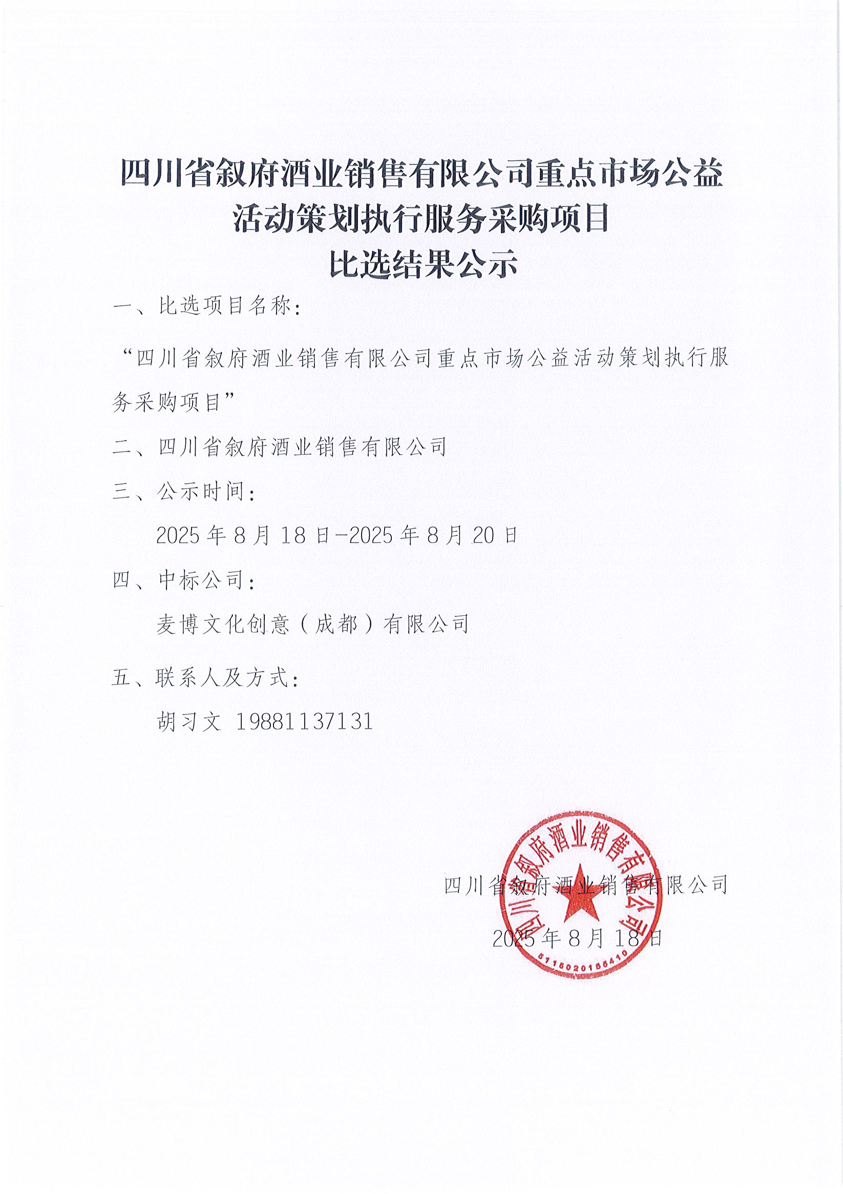 四川省敘府酒業(yè)銷(xiāo)售有限公司重點(diǎn)市場(chǎng)公益活動(dòng)策劃執行服務(wù)采購項目比選結果公示公告