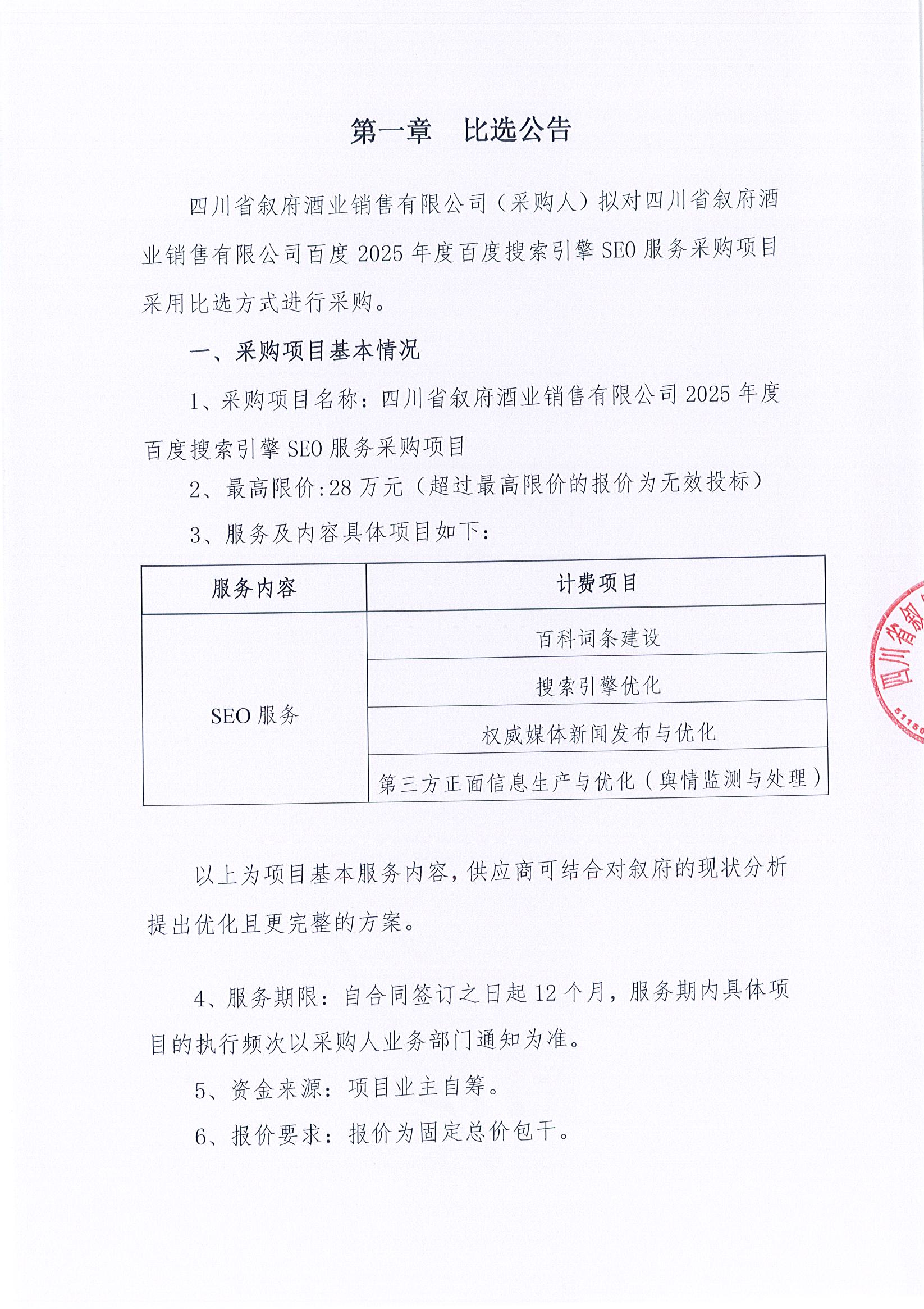 四川省敘府酒業(yè)銷(xiāo)售有限公司百度2025年度百度搜索引擎SEO服務(wù)采購項目比選公示公告