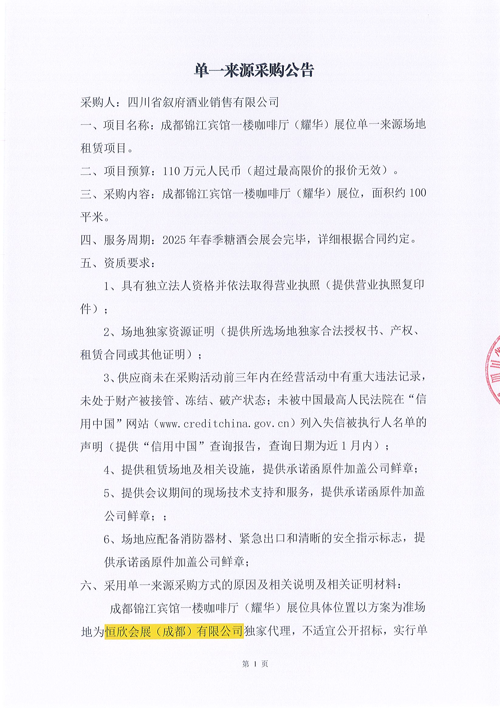 四川省敘府酒業(yè)銷(xiāo)售有限公司,對成都錦江賓館一樓咖啡廳(耀華)展位單一來(lái)源場(chǎng)地租賃項目結果公示公告