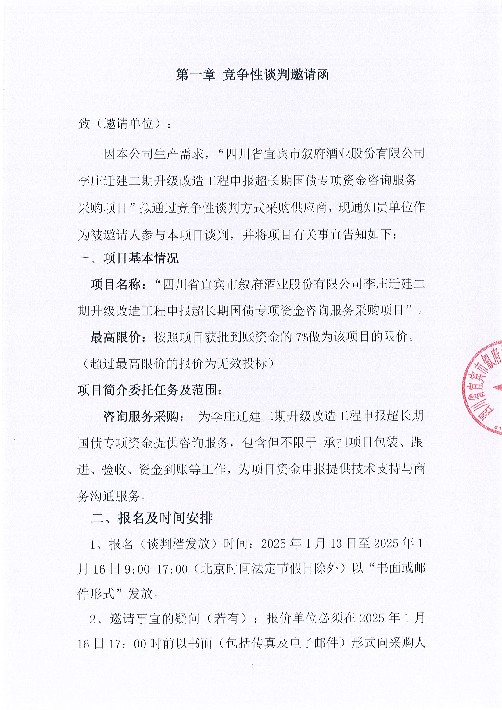 四川省宜賓市敘府酒業(yè)股份有限公司李莊遷建二期升級改造工程申報超長(cháng)期國債專(zhuān)項資金咨詢(xún)服務(wù)采購項目競爭性談判公示公告