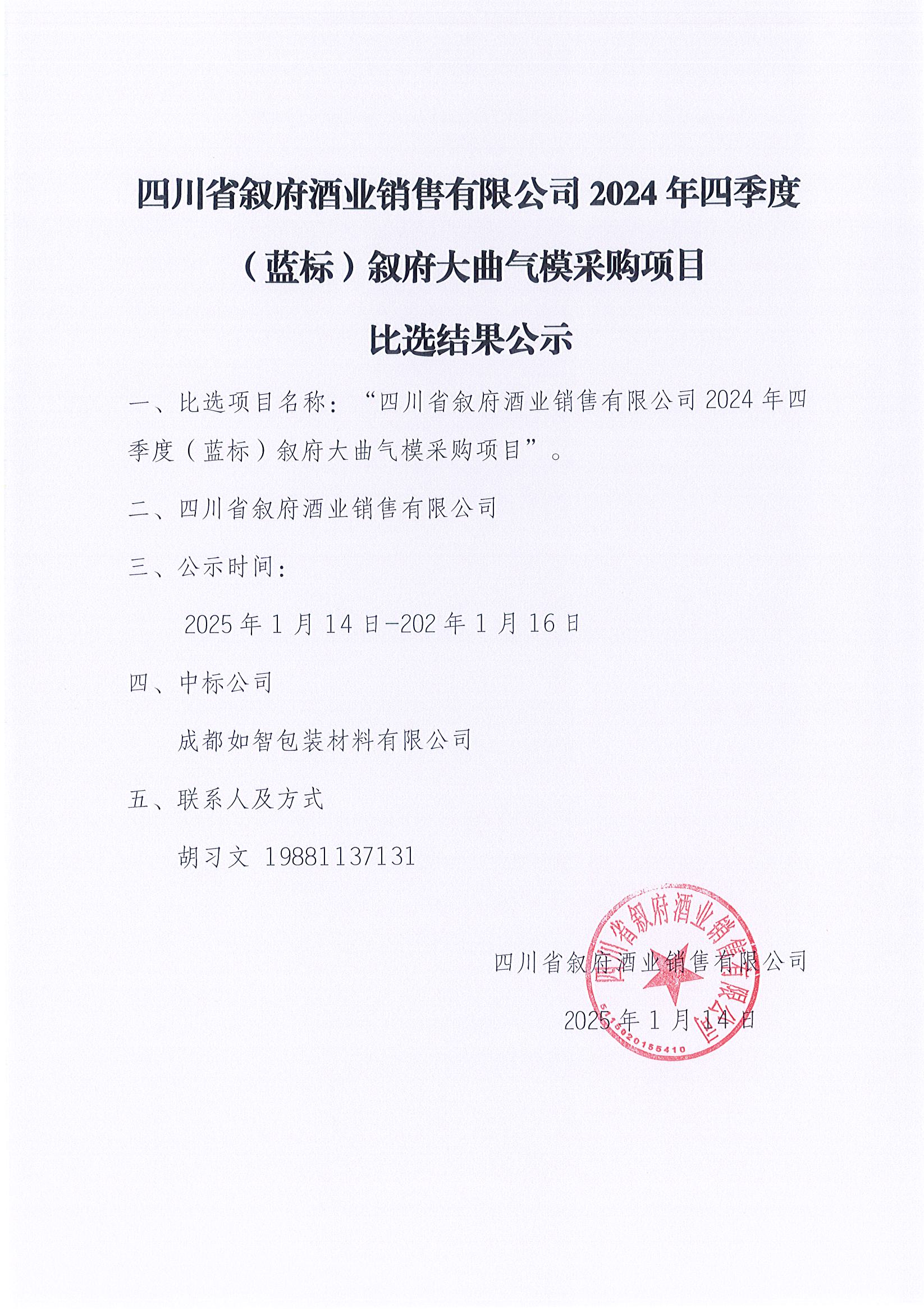 四川省敘府酒業(yè)銷(xiāo)售有限公司2024年四季度(藍標)敘府大曲氣模采購項目比選結果公示公告