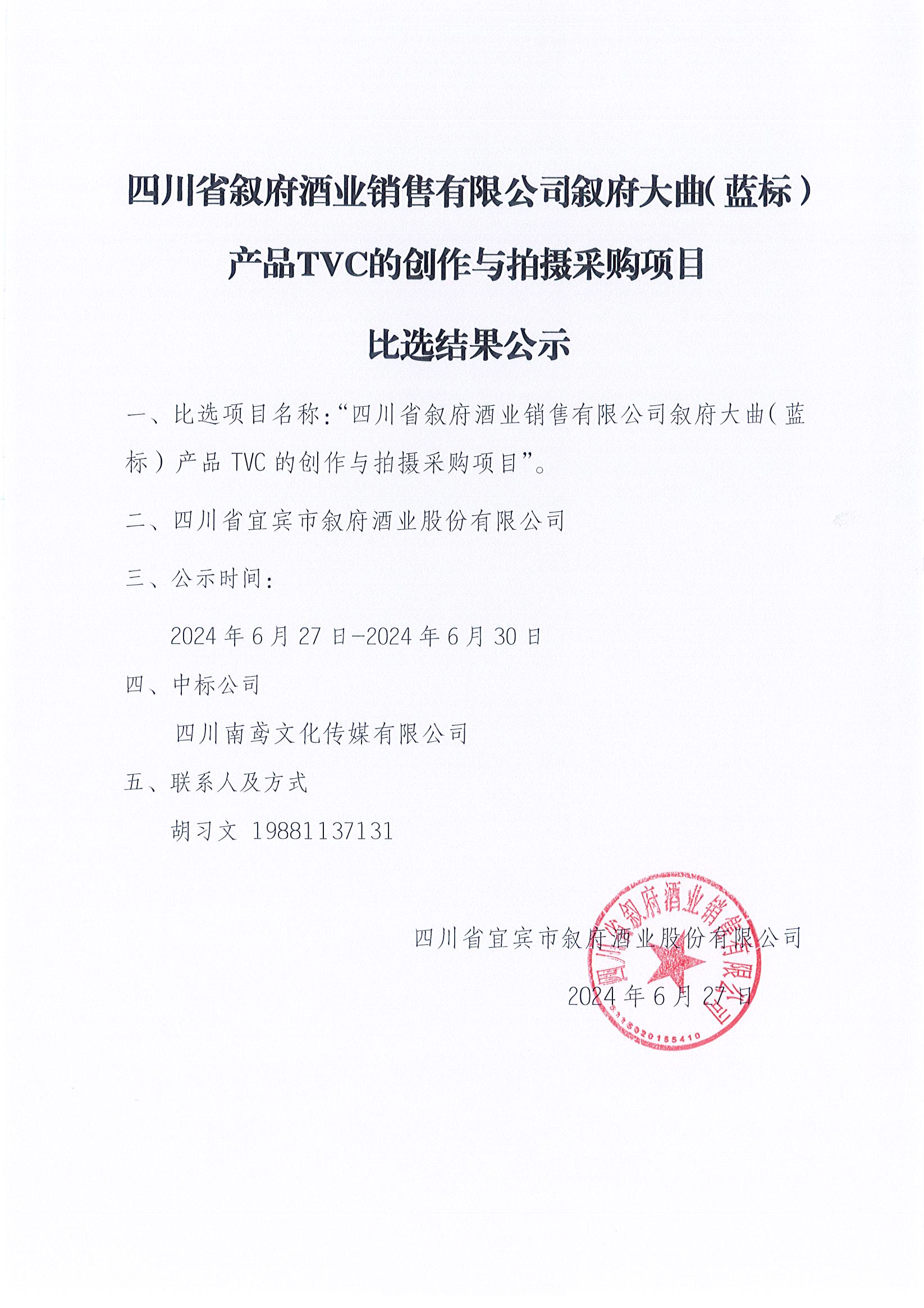 四川省敘府酒業(yè)銷(xiāo)售有限公司敘府大曲(藍標)產(chǎn)品TVC的創(chuàng )作與拍攝采購項目中標結果公示公告