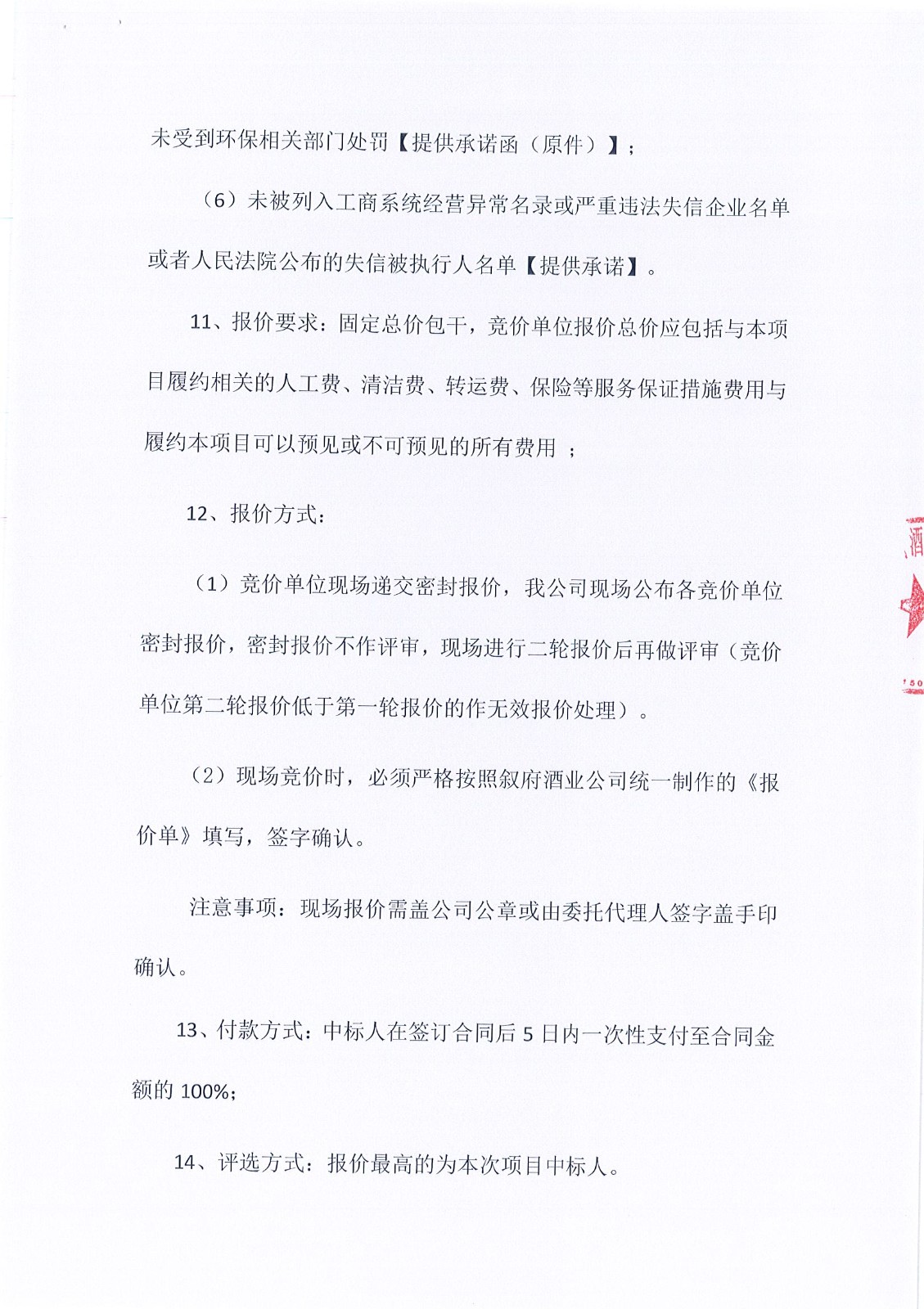 四川省宜賓市敘府酒業(yè)股份有限公司李莊廠(chǎng)區 2024年12月-2025年12月丟糟外包出售 競爭性談判項目競價(jià)公告