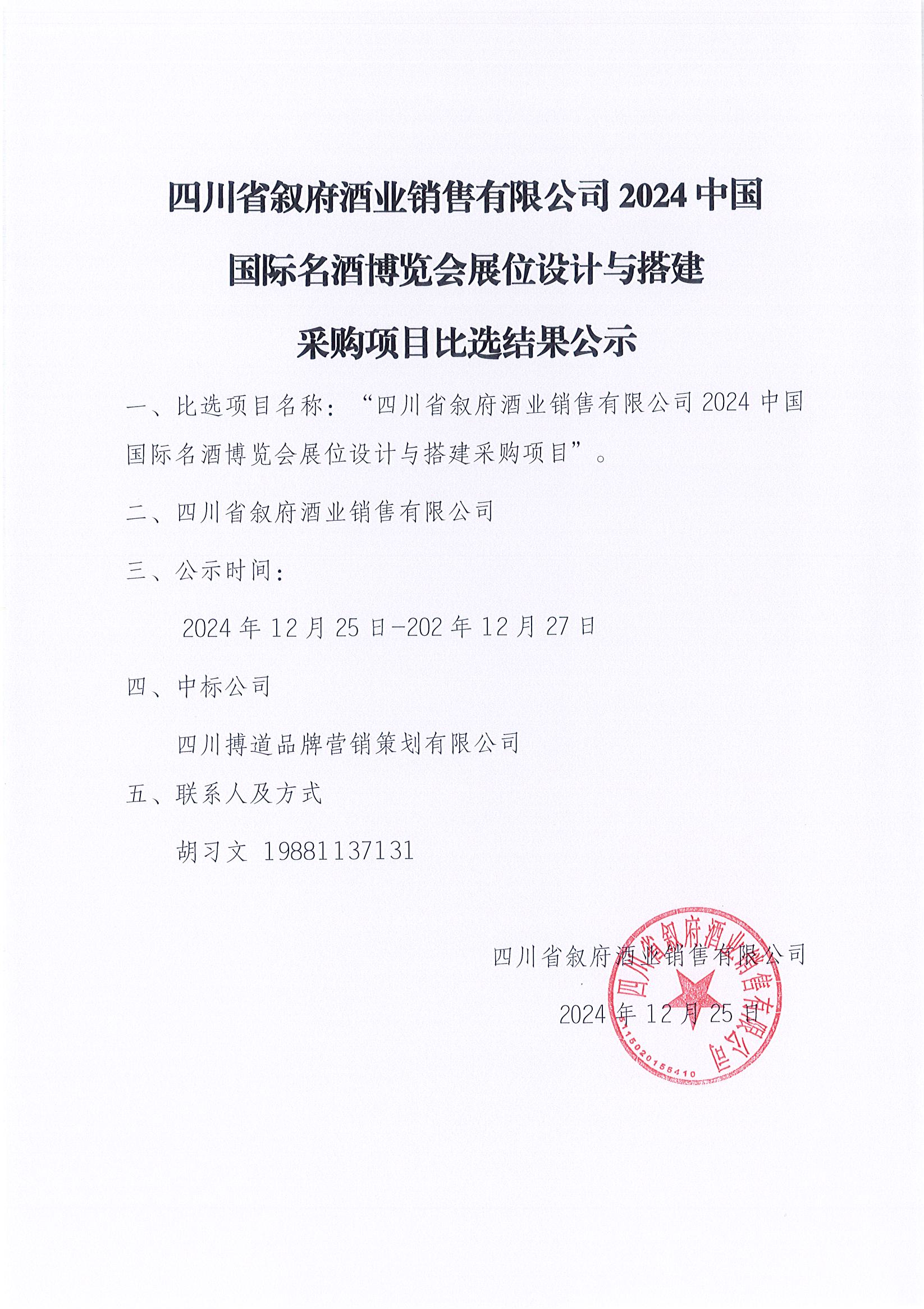 四川省敘府酒業(yè)銷(xiāo)售有限公司2024年第四季度敘府品牌廣告投放采購項目單一來(lái)源公示公告